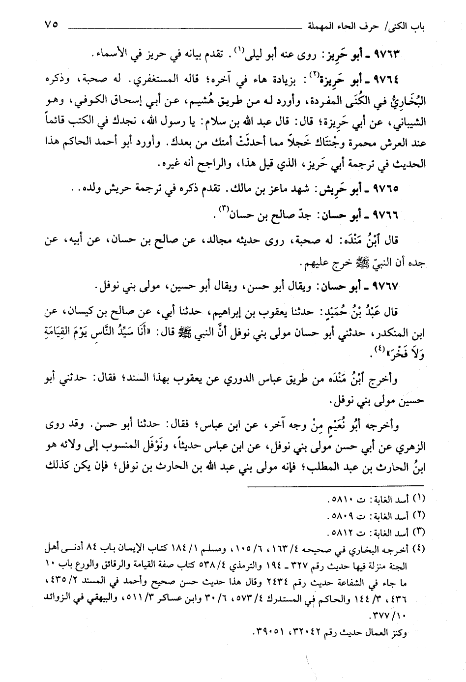 قال عبد بن حميد: حدثنا يعقوب بن إبراهيم، حدثنا أبي، عن صالح بن كيسان، عن ابن المنكدر، حدثني أبو حسان مولى بني نوفل أنّ النبي صلى اللَّه عليه وسلّم قال: «أنا سيّد النّاس يوم القيامة ولا فخر» «٤» .