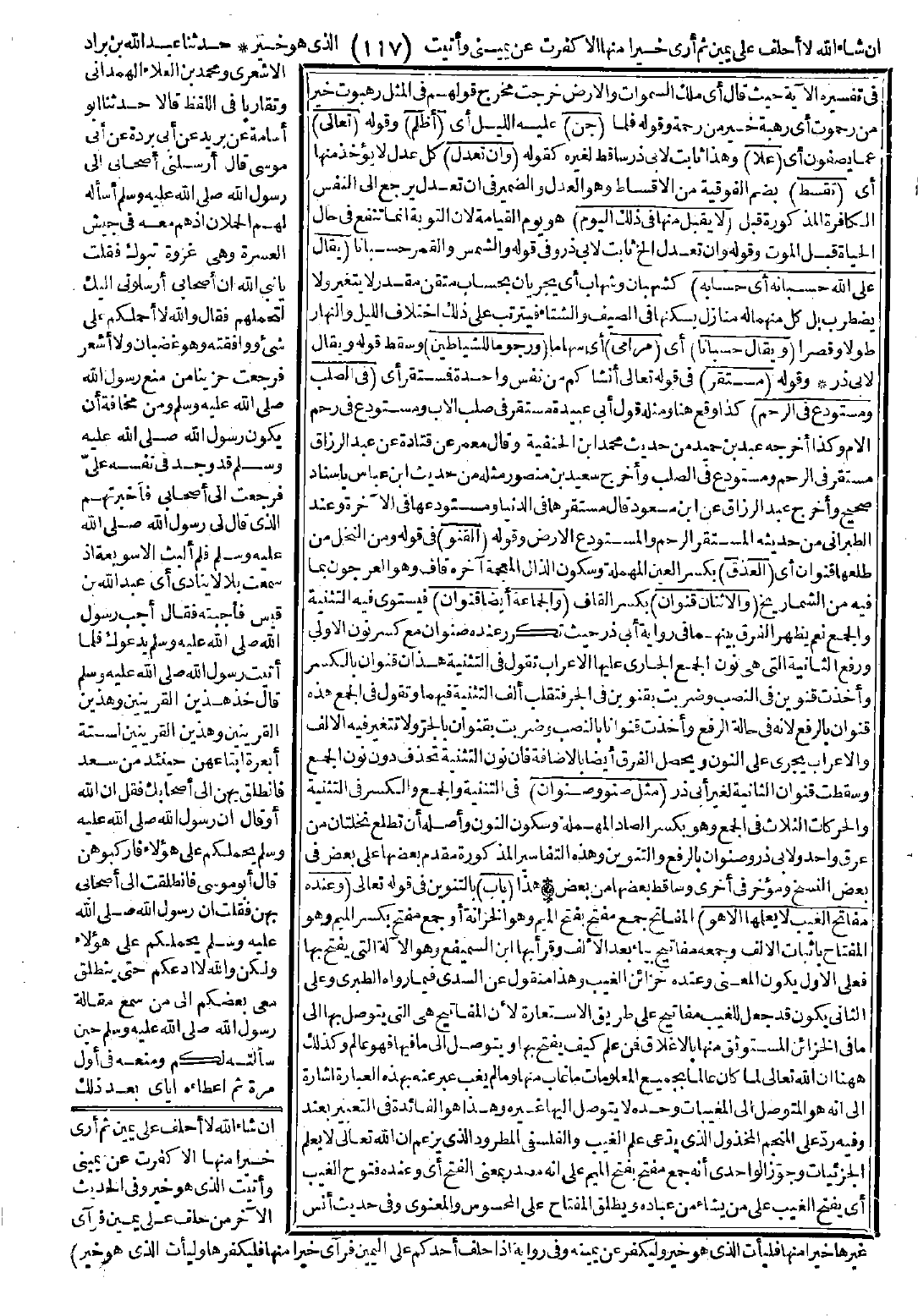 في قوله: {ومن النخل من طلعها قنوان} [الأنعام: 99] أي (العذق) بكسر العين المهملة وسكون الذال المعجمة آخره قاف وهو العرجون بما فيه من الشماريخ (والاثنان قنوان) بكسر القاف (والجماعة أيضًا قنوان) فيستوي فيه التثنية والجمع. نعم يظهر الفرق بينهما في رواية أبي ذر حيث تكرر عنده صنوان مع كسر نون الأولى ورفع الثانية التي هي نون الجمع الجاري عليها الإعراب تقول في التثنية هذان قنوان بالكسر، وأخذت قنوين في النصب، وضربت بقنوين في الجر فنقلب ألف التثنية فيهما وتقول في الجمع هذه قنوان بالرفع لأنه في حالة الرفع وأخذت قنوانًا بالنصب وضربت بقنوان بالجرّ ولا تتغير فيه الألف والإعراب يجري على النون ويحصل الفرق أيضًا بالإضافة فإن نون التثنية تحذف دون نون الجمع وسقطت قنوان الثانية لغير أبي ذر (مثل صنو وصنوان) في التثنية والجمع والكسر في التثنية والحركات الثلاث في الجمع وهو بكسر الصاد المهملة وسكون النون وأصله أن تطلع نخلتان من عرق واحد، ولأبي ذر: وصنوان بالرفع والتنوين، وهذه التفاسير المذكورة مقدم بعضها على بعض في بعض النسخ ومؤخر في أخرى وساقط في بعضها من بعض.