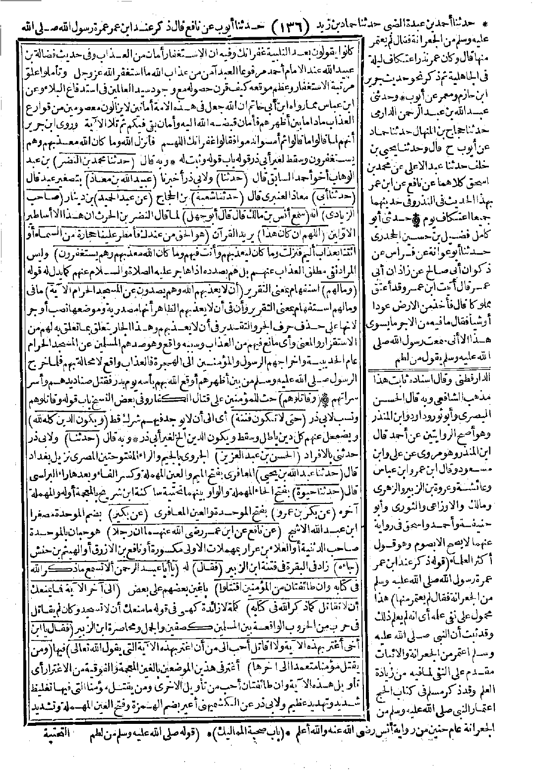 4650 - حَدَّثَنَا الْحَسَنُ بْنُ عَبْدِ الْعَزِيزِ، حَدَّثَنَا عَبْدُ اللَّهِ بْنُ يَحْيَى، حَدَّثَنَا حَيْوَةُ عَنْ بَكْرِ بْنِ عَمْرٍو، عَنْ بُكَيْرٍ عَنْ نَافِعٍ، عَنِ ابْنِ عُمَرَ -رضي الله عنهما- أَنَّ رَجُلًا جَاءَهُ فَقَالَ: يَا أَبَا عَبْدِ الرَّحْمَنِ أَلاَ تَسْمَعُ مَا ذَكَرَ اللَّهُ فِي كِتَابِهِ {وَإِنْ طَائِفَتَانِ مِنَ الْمُؤْمِنِينَ اقْتَتَلُوا} إِلَى آخِرِ الآيَةِ، فَمَا يَمْنَعُكَ أَنْ لاَ تُقَاتِلَ كَمَا ذَكَرَ اللَّهُ فِي كِتَابِهِ؟ فَقَالَ: يَا ابْنَ أَخِي أَغْتَرُّ بِهَذِهِ الآيَةِ وَلاَ أُقَاتِلُ أَحَبُّ إِلَيَّ مِنْ أَنْ أَغْتَرَّ بِهَذِهِ الآيَةِ الَّتِي يَقُولُ اللَّهُ تَعَالَى: {وَمَنْ يَقْتُلْ مُؤْمِنًا مُتَعَمِّدًا} إِلَى آخِرِهَا قَالَ: فَإِنَّ اللَّهَ يَقُولُ: {وَقَاتِلُوهُمْ حَتَّى لاَ تَكُونَ فِتْنَةٌ} قَالَ ابْنُ عُمَرَ: قَدْ فَعَلْنَا عَلَى عَهْدِ رَسُولِ اللَّهِ -صَلَّى اللَّهُ عَلَيْهِ وَسَلَّمَ- إِذْ كَانَ الإِسْلاَمُ قَلِيلًا، فَكَانَ الرَّجُلُ يُفْتَنُ فِي دِينِهِ إِمَّا يَقْتُلُوهُ، وَإِمَّا يُوثِقُوهُ، حَتَّى كَثُرَ الإِسْلاَمُ فَلَمْ تَكُنْ فِتْنَةٌ فَلَمَّا رَأَى أَنَّهُ لاَ يُوَافِقُهُ فِيمَا يُرِيدُ قَالَ: فَمَا قَوْلُكَ فِي عَلِيٍّ وَعُثْمَانَ؟ قَالَ ابْنُ عُمَرَ: مَا قَوْلِي فِي عَلِيٍّ وَعُثْمَانَ أَمَّا عُثْمَانُ فَكَانَ اللَّهُ قَدْ عَفَا عَنْهُ فَكَرِهْتُمْ أَنْ يَعْفُوَ عَنْهُ، وَأَمَّا عَلِيٌّ فَابْنُ عَمِّ رَسُولِ اللَّهِ -صَلَّى اللَّهُ عَلَيْهِ وَسَلَّمَ- وَخَتَنُهُ، وَأَشَارَ بِيَدِهِ وَهَذِهِ ابْنَتُهُ أَوْ بِنْتُهُ حَيْثُ تَرَوْنَ.