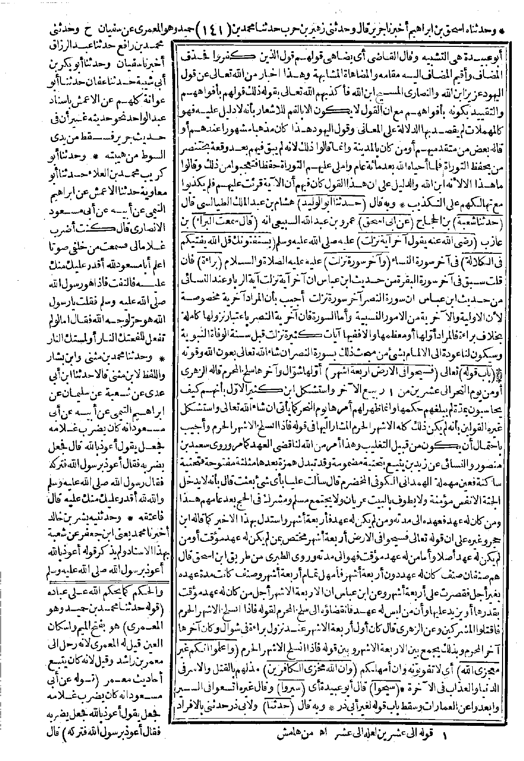 روى سعيد بن منصور والنسائي عن زيد بن يثيع بتحتية مضمومة وقد تبدل همزة بعدها مثلثة مفتوحة فتحتية ساكنة فعين مهملة الهمداني الكوفي المخضرم قال: سألت عليًّا بأي شيء بعثت؟ قال: بأنه لا يدخل الجنة إلا نفس مؤمنة ولا يطوف بالبيت عريان ولا يجتمع مسلم ومشرك في الحج بعد عامهم هذا، ومن كان له عهد فعهده إلى مدته ومن لم يكن له عهد فأربعة أشهر، واستدلّ بهذا الأخير كما قاله ابن حجر وغيره على أن قوله تعالى: {فسيحوا في الأرض أربعة أشهر} مختص بمن لم يكن له عهد مؤقت أو من لم يكن له عهد أصلاً، وأما من له عهد مؤقت فهو إلى مدته وروى الطبري من طريق ابن إسحاق قال: هم صنفان. صنف كان له عهد دون أربعة أشهر فأمهل تمام أربعة أشهر وصنف كانت مدة عهده بغير أجل فقصرت على أربعة أشهر وعن ابن عباس أن الأربعة الأشهر أجل من كان له عهد مؤقت بقدرها أو يزيد عليها وأن من ليس له عهد فانقضاؤه إلى سلخ المحرم لقوله: {فإذا انسلخ الأشهر المحرم فاقتلوا المشركين} [التوبة: 5] وعن الزهري قال: كان أول أربعة الأشهر عند نزول براءة في شوال، وكان آخرها آخر المحرم وبذلك يجمع بين الأربعة الأشهر وبين قوله: {فإذا انسلخ الأشهر المحرم}.