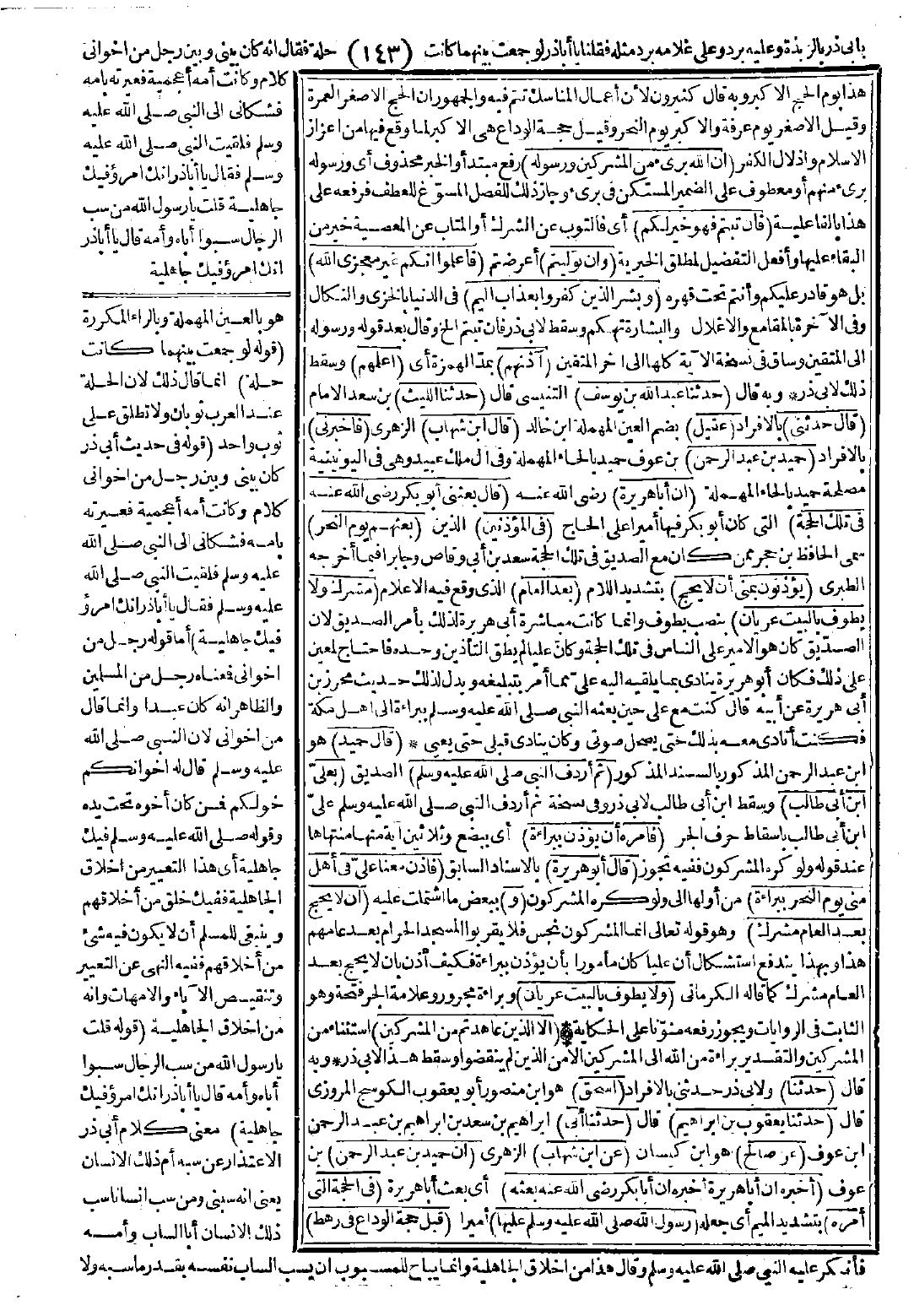 (حميد بن عبد الرحمن) بن عوف حميد بالحاء المهملة وفي آل ملك عبيد وهي في اليونينية مصلحة حميد بالحاء المهملة (أن أبا هريرة) -رضي الله عنه- (قال: بعثني أبو بكر رضي الله عنه في تلك الحجة) التي كان أبو بكر فيها أميرًا على الحاج (في المؤذنين) الذين (بعثهم يوم النحر) سمى الحافظ ابن حجر ممن كان مع الصديق في تلك الحجة سعد بن أبي وقاص وجابرًا فيما أخرجه الطبري (يؤذنون بمنى أن لا يحج) بتشديد اللام (بعد العام) الذي وقع فيه الإعلام (مشرك ولا يطوف بالبيت عريان). بنصب يطوف وإنما كانت مباشرة أبي هريرة لذلك بأمر الصديق، لأن الصدّيق كان هو الأمير على الناس في تلك الحجة، وكان عليًّا لم يطق التأذين وحده فاحتاج لمعين على ذلك، فكان أبو هريرة ينادي بما يلقيه إليه عليّ مما أمر بتبليغه، ويدل لذلك حديث محرز بن أبي هريرة عن أبيه قال: كنت مع علي حين بعثه النبي -صَلَّى اللَّهُ عَلَيْهِ وَسَلَّمَ- ببراءة إلى أهل مكة فكنت أنادي معه بذلك حتى يصحل صوتي وكان ينادي قبلي حتى يعني.