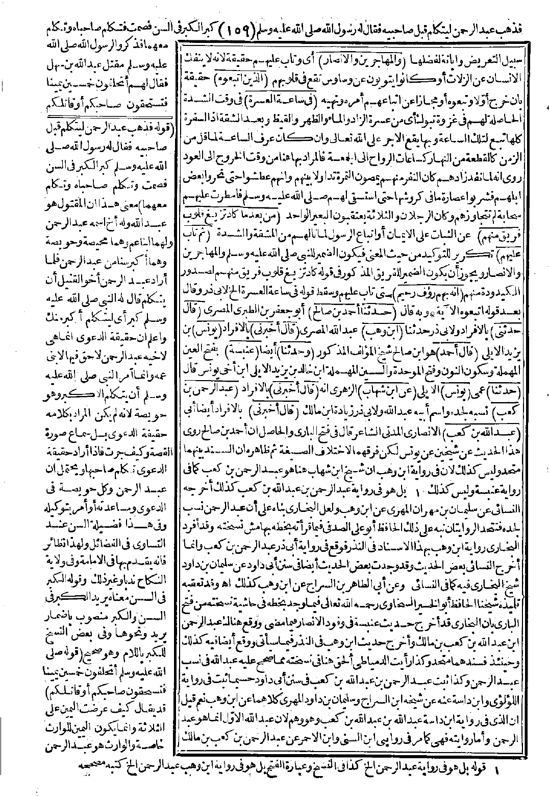 قال في فتح الباري: والحاصل أن أحمد بن صالح روى هذا الحديث عن شيخين عن يونس لكن فرقهما لاختلاف الصيغة، ثم ظاهره أن السند بينهما متحد وليس كذلك لأن في رواية ابن وهب أن شيخ ابن شهاب هنا هو عبد الرحمن بن كعب كما في رواية عنبسة وليس كذلك بل هو في رواية عبد الرحمن بن عبد الله بن كعب كذلك أخرجه النسائي عن سليمان بن مهران عن ابن وهب، ولعل البخاري بناه على أن عبد الرحمن نسب لجده فتتحد الروايتان على ذلك الحافظ أبو علي الصدفي فيما قرأته بخطه بهامش نسخته وقد أفرد البخاري رواية ابن وهب بهذا الإسناد في النذر فوقع في رواية أبي ذر عبد الرحمن بن كعب، وإنما أخرج النسائي بعض الحديث وقد وجدت بعض الحديث أيضًا في سنن أبي داود عن سليمان بن داود شيخ البخاري فيه كما في النسائي، وعن أبي الطاهر بن السراج عن ابن وهب كذلك.