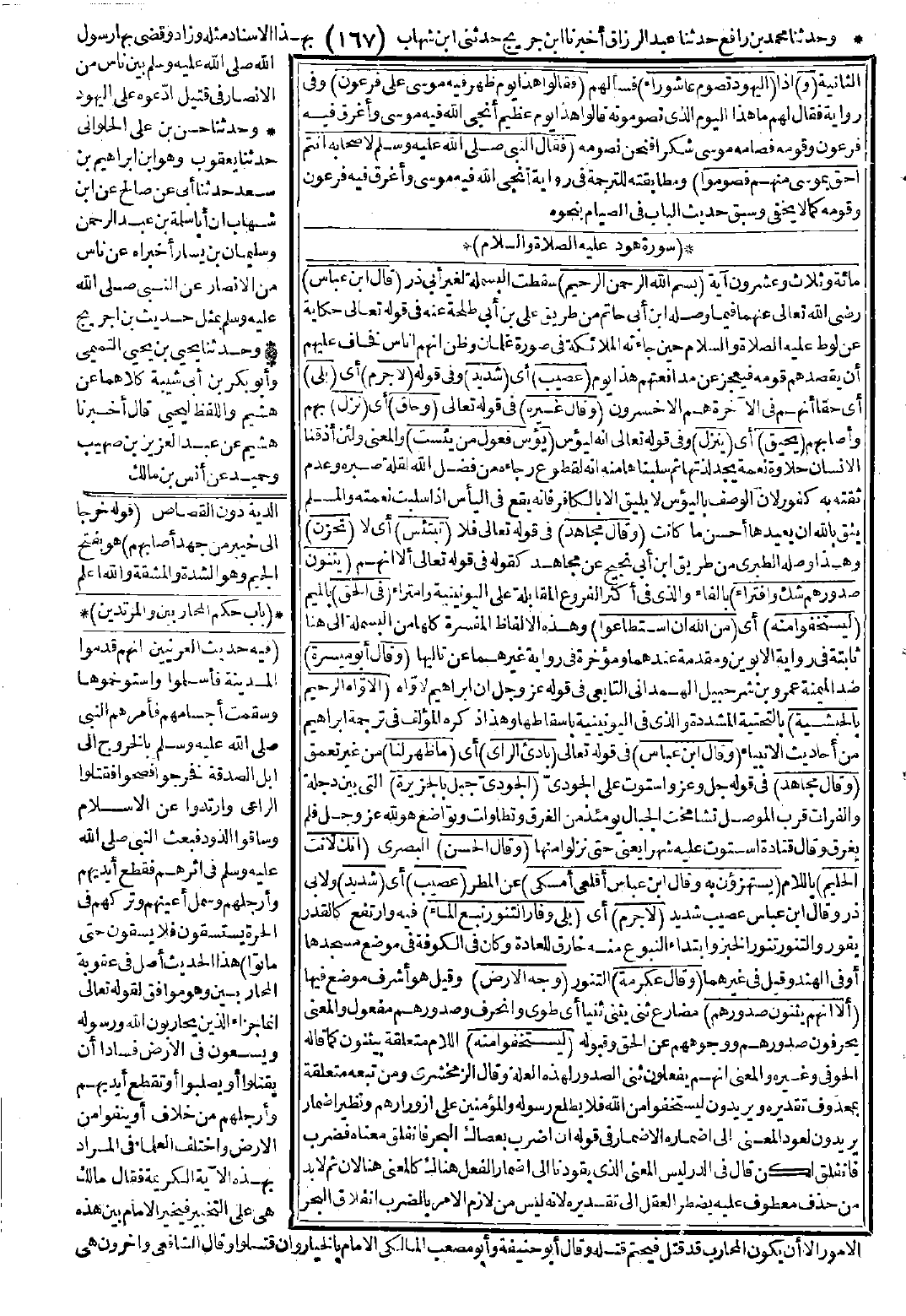 وَقَالَ ابْنُ عَبَّاسٍ: عَصِيبٌ: شَدِيدٌ، لاَ جَرَمَ: بَلَى. (وَقَالَ غَيْرُهُ: وَحَاقَ: نَزَلَ، يَحِيقُ: يَنْزِلُ، يَؤُوسٌ، فَعُولٌ مِنْ يَئِسْتُ، وَقَالَ مُجَاهِدٌ: تَبْتَئِسْ: تَحْزَنْ، يَثْنُونَ صُدُورَهُمْ شَكٌّ وَافْتِرَاءٌ فِي الحَقِّ، لِيَسْتَخْفُوا مِنْهُ مِنَ اللهِ إِنِ اسْتَطَاعُوا) (وَقَالَ أَبُو مَيْسَرَةَ الأَوَّاهُ الرَّحِيمُ بِالْحَبَشِيَّةِ، وَقَالَ ابْنُ عَبَّاسٍ: بَادِئَ الرَّأْيِ مَا ظَهَرَ لَنَا، وَقَالَ مُجَاهِدٌ: الْجُودِيُّ: جَبَلٌ بِالْجَزِيرَةِ، وَقَالَ الْحَسَنُ: إِنَّكَ لأَنْتَ الْحَلِيمُ يَسْتَهْزِئُونَ بِهِ. وَقَالَ ابْنُ عَبَّاسٍ: أَقْلِعِي: أَمْسِكِي، عَصِيبٌ: شَدِيدٌ، لاَ جَرَمَ: بَلَى، وَفَارَ التَّنُّورُ: نَبَعَ الْمَاءُ، وَقَالَ عِكْرِمَةُ: وَجْهُ الأَرْضِ).