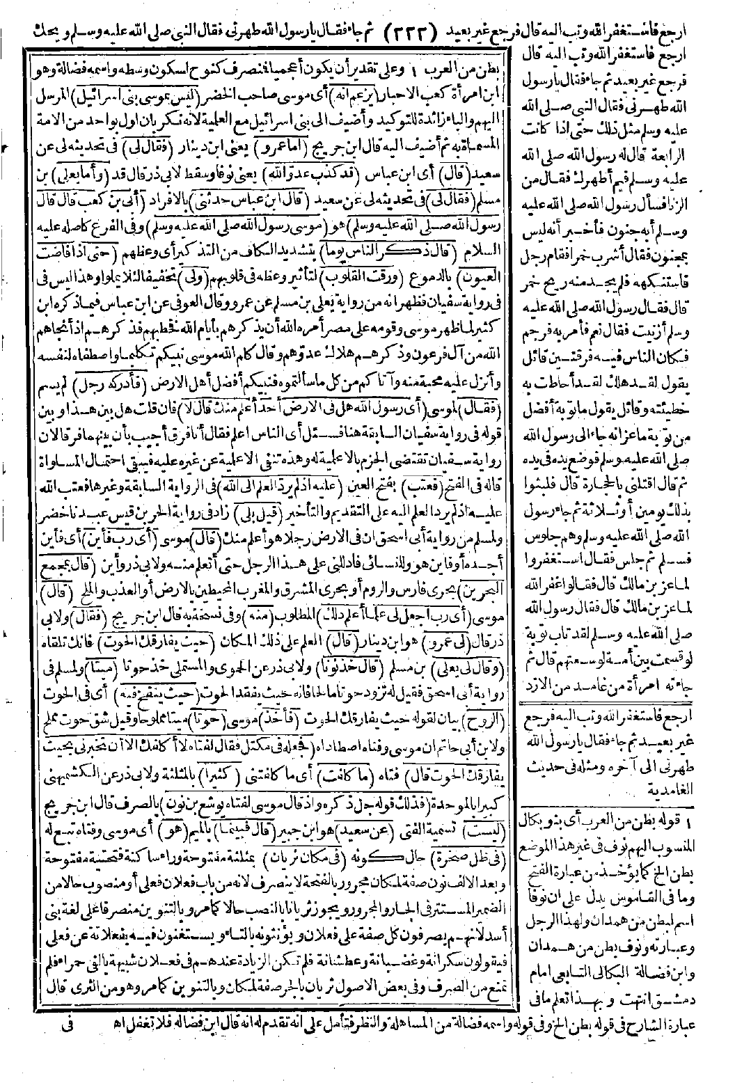 (فعتب) بفتح العين (عليه إذ لم يردّ العلم إلى الله) في الرواية السابقة وغيرها فعتب الله عليه إذ لم يرد العلم إليه على التقديم والتأخير (قيل بلى) زاد في رواية الحر بن قيس عبدنا خضر ولمسلم من رواية أبي إسحاق أن في الأرض رجلًا هو أعلم منك (قال) موسى (أي رب فأين) أي فأين أجده أو فأين هو وللنسائي فادللني على هذا الرجل حتى أتعلم منه ولأبي ذر وأين (قال بمجمع البحرين) بحري فارس والروم أو بحري الشرق والمغرب المحيطين بالأرض أو العذب والملح (قال) موسى (أي رب اجعل لي علمًا أعلم ذلك) المطلوب (منه) وفي نسخة به قال ابن جريج (فقال) ولأبي ذر قال (لي عمرو) هو ابن دينار (قال): العلم على ذلك المكان (حيث يفارقك الحوت) فإنك تلقاه (وقال لي يعلى) بن مسلم (قال: خذ نونًا) ولأبي ذر عن الحموي والمستملي خذ حوتًا (ميتًا) ولمسلم في رواية أبي إسحاق فقيل له تزود حوتًا مالحًا فإنه حيث يفقد الحوت (حيث ينفخ فيه) أي في الحوت (الروح) بيان لقوله حيث يفارقك الحوت (فأخذ) موسى (حوتًا) ميتًا مملوحًا وقيل شق حوت مملح ولابن أبي حاتم أن موسى وفتاه اصطاداه (فجعله في مكتل فقال لفتاه لا أكلفك إلا أن تخبرني بحيث يفارقك الحوت قال) فتاه (ما كلفت) أي ما كلفتني (كثيرًا) بالمثلثة ولأبي ذر عن الكشميهني كبيرًا بالموحدة (فذلك قوله جل ذكره {وإذ قال موسى لفتاه} يوشع بن نون) بالصرف قال ابن جريج (ليست) تسمية الفتى (عن سعيد) هو ابن جبير (قال فبينما) بالميم (هو) أي موسى وفتاه تبع له (في ظل صخرة) حال كونه (في مكان ثريان) بمثلثة مفتوحة وراء ساكنة فتحتية