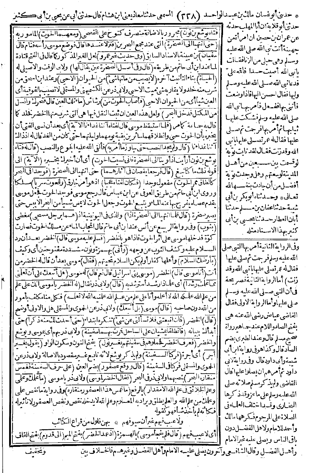 (فلما استيقظ موسى قال لفتاه: {آتنا غداءنا} الآية) أي بعد أن نسي الفتى أن يخبره بأن الحوت حيي وانطلاقهما سائرين بقية يومهما وليلتهما حتى كان من الغد قال له إذ ذاك آتنا غداءنا (قال ولم يجد النصب حتى جاوز ما أمر به) فألقى الله عليه الجوع والنصب (قال له فتاه يوشع بن نون {أرأيت إذ أوينا إلى الصخرة فإني نسيت الحوت) أي أن أخبرك بخبره (الآية) إلى قوله: {ذلك ما كنا نبغ} [الكهف: 64] (قال فرجعا يقصّان في آثارهما) حتى انتهيا إلى الصخرة (فوجدا في البحر كالطاق ممر الحوت) مفعول وجدا (فكان لفتاه عجبًا) إذ هو أمر خارق (وللحوت سربًا) مسلكًا وروى ابن أبي حاتم من طريق العوفي عن ابن عباس قال: رجع موسى فوجد الحوت فجعل موسى يقدم عصاه يفرج بها عنه الماء ويتبع الحوت وجعل الحوت لا يمس شيئًا من البحر إلا يبس حتى يصير صخرة (قال: فلما انتهيا إلى الصخرة إذا) والذي في اليونينية إذ (هما برجل مسجى) مغطى (بثوب) وفي رواية الربيع عن أنس عند ابن أبي حاتم قال انجاب الماء عن مسلك الحوت فصارت كوّة فدخلها موسى على أثر الحوت فإذا هو بالخضر (فسلم عليه موسى قال) الخضر بعد أن رد السلام عليه وكشف الثوب عن وجهه (وأنى) بهمزة نون مشددة مفتوحتين أي وكيف (بأرضك السلام) وأهلها كفار أو لم يكن السلام تحيتهم (فقال) موسى بعد أن قال له الخضر من أنت: (أنا موسى قال) الخضر (موسى بني إسرائيل؟ قال: نعم. قال) له موسى: ({هل أتبعك على أن تعلمني مما علمت رشدًا}) أي علمًا ذا رشد أسترشد به (قال) ولأبي ذر فقال (له الخضر: يا موسى إنك على علم من علم الله علمكه الله لا أعلمه وأنا على علم من علم الله علمنيه الله لا تعلمه) فكل منا مكلف بأمور من الله دون صاحبه (قال) موسى (بل أتبعك) ولأبي ذر عن الحموي والمستملي هل والأولى أوضح ({قال}) الخضر: ({فإن اتبعتني فلا تسألني عن شيء}) تنكره ابتداء ({حتى أحدث لك منه ذكرًا}) حتى أبداك ببيانه (فانطلقا يمشيان على الساحل فمرت بهما سفينة) ولأبي ذر: بهم أي بموسى ويوشع والخضر (فعرف الخضر فحملوهم في سفينتهم بغير نول) بفتح النون وسكون الواو (يقول بغير أجر) أي أجرة (فركبا السفينة) ولم يذكر يوشع لأنه تابع غير مقصود بالأصالة ولأبي ذر عن الحموي والمستملي فركبا في السفينة (قال: ووقع عصفور) بضم العين (على حرف السفينة فغمس منقاره البحر) بنصبهما ولأبي ذر في البحر (فقال الخضر لموسى) ولأبي ذر: يا موسى (ما علمك وعلمي وعلم الخلائق في علم الله إلا مقدار) بالرفع (ما غمس هذا العصفور منقاره) وفي رواية ما نقص علمي وعلمك من علم الله والعلم يطلق ويراد به المعلوم وعلم الله لا يدخله نقص ونقص العصفور لا تأثير له فكأنه لم يأخذ شيئًا فهو كقوله: