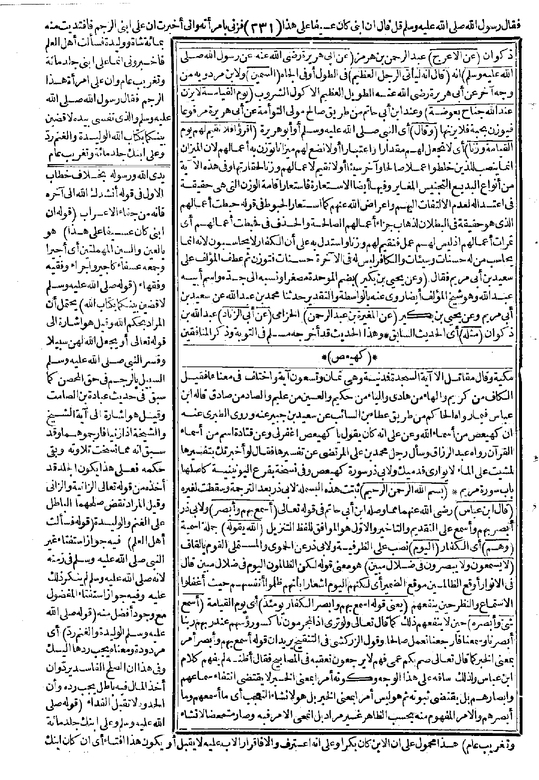 ابن عباس فيما رواه الحاكم من طريق عطاء بن السائب عن سعيد بن جبير عنه، وروى الطبري عنه أن كهيعص من أسماء الله وعن علي أنه كان يقول يا كهيعص اغفر لي، وعن قتادة اسم من أسماء القرآن رواه عبد الرزاق، وسأل رجل محمد بن علي المرتضى عن تفسيرها فقال لو أخبرتك بتفسيرها لمشيت على الماء لا يواري قدميك، ولأبي ذر سورة كهيعص، وفي نسخة بفرع اليونينية كأصلها باب سورة مريم.
