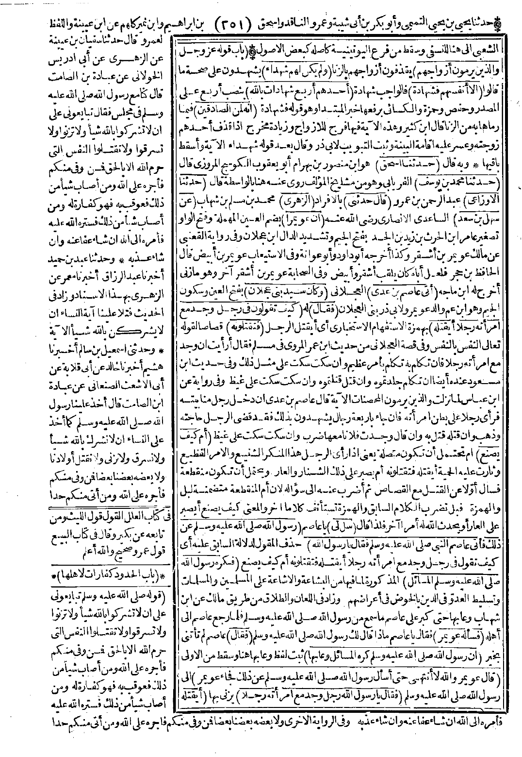 وفي قصة العجلاني من حديث ابن عمر المروي في مسلم فقال: أرأيت إن وجد مع امرأته رجلًا فإن تكلم به تكلم بأمر عظيم وإن سكت سكت على مثل ذلك. وفي حديث ابن مسعود عنده أيضًا إن تكلم جلدتموه وإن قتل قتلتموه وإن سكت سكت على غيظ. وفي رواية عن ابن عباس لما نزلت {والذين يرمون المحصنات} [النور: 4] الآية. قال عاصم بن عدي: إن دخل رجل منا بيته فرأى رجلًا على بطن امرأته فإن جاء بأربعة رجال يشهدون بذلك فقد قضى الرجل حاجته وذهب وإن قتله قتُل به، وإن قال وجدت فلانًا معها ضرب وإن سكت سكت على غيظ.