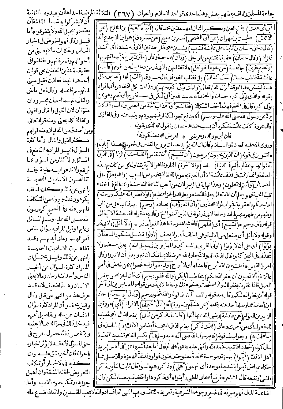 وَبَلَغَ الأَمْرُ إِلَى ذَلِكَ الرَّجُلِ الَّذِي قِيلَ لَهُ، فَقَالَ: سُبْحَانَ اللَّهِ، وَاللَّهِ مَا كَشَفْتُ كَنَفَ أُنْثَى قَطُّ. قَالَتْ عَائِشَةُ: فَقُتِلَ شَهِيدًا فِي سَبِيلِ اللَّهِ. قَالَتْ: وَأَصْبَحَ أَبَوَايَ عِنْدِي، فَلَمْ يَزَالاَ حَتَّى دَخَلَ عَلَيَّ رَسُولُ اللَّهِ -صَلَّى اللَّهُ عَلَيْهِ وَسَلَّمَ- وَقَدْ صَلَّى الْعَصْرَ، ثُمَّ دَخَلَ وَقَدِ اكْتَنَفَنِي أَبَوَايَ عَنْ يَمِينِي وَعَنْ شِمَالِى فَحَمِدَ اللَّهَ وَأَثْنَى عَلَيْهِ، ثُمَّ قَالَ: «أَمَّا بَعْدُ يَا عَائِشَةُ، إِنْ كُنْتِ قَارَفْتِ سُوءًا أَوْ ظَلَمْتِ فَتُوبِي إِلَى اللَّهِ، فَإِنَّ اللَّهَ يَقْبَلُ التَّوْبَةَ مِنْ عِبَادِهِ». قَالَتْ: وَقَدْ جَاءَتِ امْرَأَةٌ مِنَ الأَنْصَارِ فَهْيَ جَالِسَةٌ بِالْبَابِ، فَقُلْتُ: أَلاَ تَسْتَحِي مِنْ هَذِهِ الْمَرْأَةِ أَنْ تَذْكُرَ شَيْئًا. فَوَعَظَ رَسُولُ اللَّهِ -صَلَّى اللَّهُ عَلَيْهِ وَسَلَّمَ- فَالْتَفَتُّ إِلَى أَبِي فَقُلْتُ: أَجِبْهُ، قَالَ: فَمَاذَا أَقُولُ، فَالْتَفَتُّ إِلَى أُمِّي فَقُلْتُ: أَجِيبِيهِ، فَقَالَتْ: أَقُولُ مَاذَا؟ فَلَمَّا لَمْ يُجِيبَاهُ، تَشَهَّدْتُ فَحَمِدْتُ اللَّهَ وَأَثْنَيْتُ عَلَيْهِ بِمَا هُوَ أَهْلُهُ ثُمَّ قُلْتُ: أَمَّا بَعْدُ فَوَاللَّهِ لَئِنْ قُلْتُ لَكُمْ إِنِّي لَمْ أَفْعَلْ، وَاللَّهُ عَزَّ وَجَلَّ يَشْهَدُ إِنِّي لَصَادِقَةٌ مَا ذَاكَ بِنَافِعِي عِنْدَكُمْ، لَقَدْ تَكَلَّمْتُمْ بِهِ وَأُشْرِبَتْهُ قُلُوبُكُمْ وَإِنْ قُلْتُ إِنِّي فَعَلْتُ وَاللَّهُ يَعْلَمُ أَنِّي لَمْ أَفْعَلْ، لَتَقُولُنَّ قَدْ بَاءَتْ بِهِ عَلَى نَفْسِهَا. وَإِنِّي وَاللَّهِ مَا أَجِدُ لِي وَلَكُمْ مَثَلًا، وَالْتَمَسْتُ اسْمَ يَعْقُوبَ فَلَمْ أَقْدِرْ عَلَيْهِ، إِلاَّ أَبَا يُوسُفَ حِينَ قَالَ: {فَصَبْرٌ جَمِيلٌ وَاللَّهُ الْمُسْتَعَانُ عَلَى مَا تَصِفُونَ} وَأُنْزِلَ عَلَى رَسُولِ اللَّهِ -صَلَّى اللَّهُ عَلَيْهِ وَسَلَّمَ- مِنْ سَاعَتِهِ، فَسَكَتْنَا، فَرُفِعَ عَنْهُ، وَإِنِّي لأَتَبَيَّنُ السُّرُورَ فِي وَجْهِهِ وَهْوَ يَمْسَحُ جَبِينَهُ وَيَقُولُ: «أَبْشِرِي يَا عَائِشَةُ، فَقَدْ أَنْزَلَ اللَّهُ بَرَاءَتَكِ»، قَالَتْ: وَكُنْتُ أَشَدَّ مَا كُنْتُ غَضَبًا، فَقَالَ لِي أَبَوَايَ: قُومِي إِلَيْهِ. فَقُلْتُ: وَاللَّهِ لاَ أَقُومُ إِلَيْهِ، وَلاَ أَحْمَدُهُ وَلاَ أَحْمَدُكُمَا، وَلَكِنْ أَحْمَدُ اللَّهَ الَّذِي أَنْزَلَ بَرَاءَتِي لَقَدْ سَمِعْتُمُوهُ فَمَا أَنْكَرْتُمُوهُ وَلاَ غَيَّرْتُمُوهُ. وَكَانَتْ عَائِشَةُ تَقُولُ: أَمَّا زَيْنَبُ ابْنَةُ جَحْشٍ فَعَصَمَهَا اللَّهُ بِدِينِهَا فَلَمْ تَقُلْ إِلاَّ خَيْرًا، وَأَمَّا أُخْتُهَا حَمْنَةُ فَهَلَكَتْ فِيمَنْ هَلَكَ. وَكَانَ الَّذِي يَتَكَلَّمُ فِيهِ مِسْطَحٌ وَحَسَّانُ بْنُ ثَابِتٍ وَالْمُنَافِقُ عَبْدُ اللَّهِ بْنُ أُبَيٍّ وَهْوَ الَّذِي كَانَ يَسْتَوْشِيهِ وَيَجْمَعُهُ، وَهْوَ الَّذِي تَوَلَّى كِبْرَهُ مِنْهُمْ هُوَ وَحَمْنَةُ. قَالَتْ: فَحَلَفَ أَبُو بَكْرٍ أَنْ لاَ يَنْفَعَ مِسْطَحًا بِنَافِعَةٍ أَبَدًا. فَأَنْزَلَ اللَّهُ عَزَّ وَجَلَّ: {وَلاَ يَأْتَلِ أُولُو الْفَضْلِ مِنْكُمْ} إِلَى آخِرِ الآيَةِ يَعْنِي أَبَا بَكْرٍ {وَالسَّعَةِ أَنْ يُؤْتُوا أُولِى الْقُرْبَى وَالْمَسَاكِينَ} يَعْنِي مِسْطَحًا إِلَى قَوْلِهِ: {أَلاَ تُحِبُّونَ أَنْ يَغْفِرَ اللَّهُ لَكُمْ وَاللَّهُ غَفُورٌ رَحِيمٌ} [النور: 22] حَتَّى قَالَ أَبُو بَكْرٍ: بَلَى وَاللَّهِ يَا رَبَّنَا، إِنَّا لَنُحِبُّ أَنْ تَغْفِرَ لَنَا، وَعَادَ لَهُ بِمَا كَانَ يَصْنَعُ.