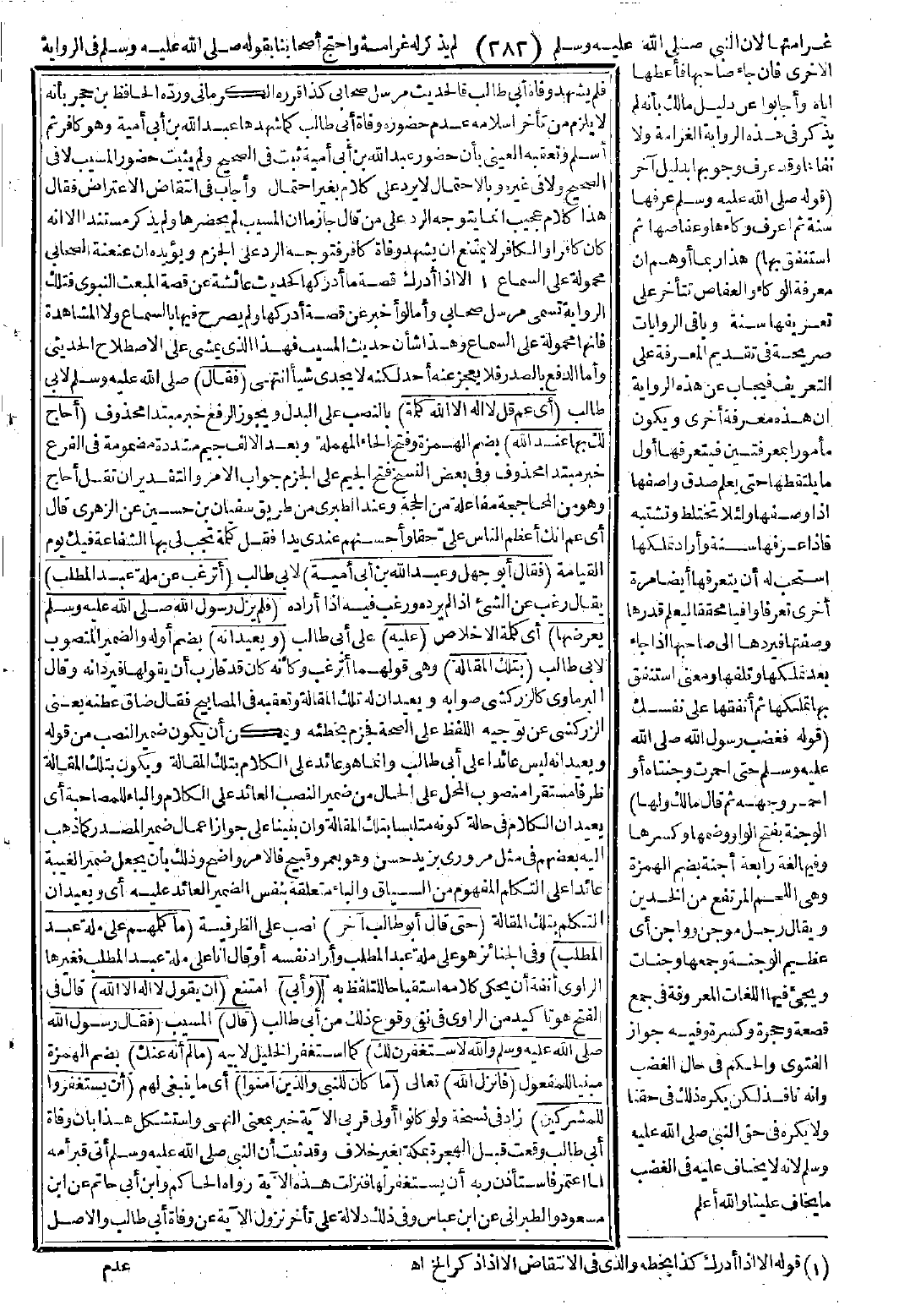 وأجاب في انتقاض الاعتراض فقال: هذا كلام عجيب إنما يتوجه الرد على من قال جازمًا إن المسيب لم يحضرها ولم يذكر مستندًا إلا أنه كان كافرًا لا يمتنع أن يشهد وفاة كافر فتوجه الرد على الجزم، ويؤيده أن عنعنة الصحابي محمولة على السماع إلا إذا أدرك قصة ما أدركها كحديث عائشة عن قصة المبعث النبوي فتلك الرواية تسمى مرسل صحابي، وأما لو أخبر عن قصة أدركها ولم يصرح فيها بالسماع ولا المشاهدة فإنها محمولة على السماع وهذا شأن حديث المسيب فهذا الذي يمشي على الاصطلاح الحديثي وأما الدفع بالصدر فلا يعجز عنه أحد لكنه لا يجدي شيئًا انتهى.