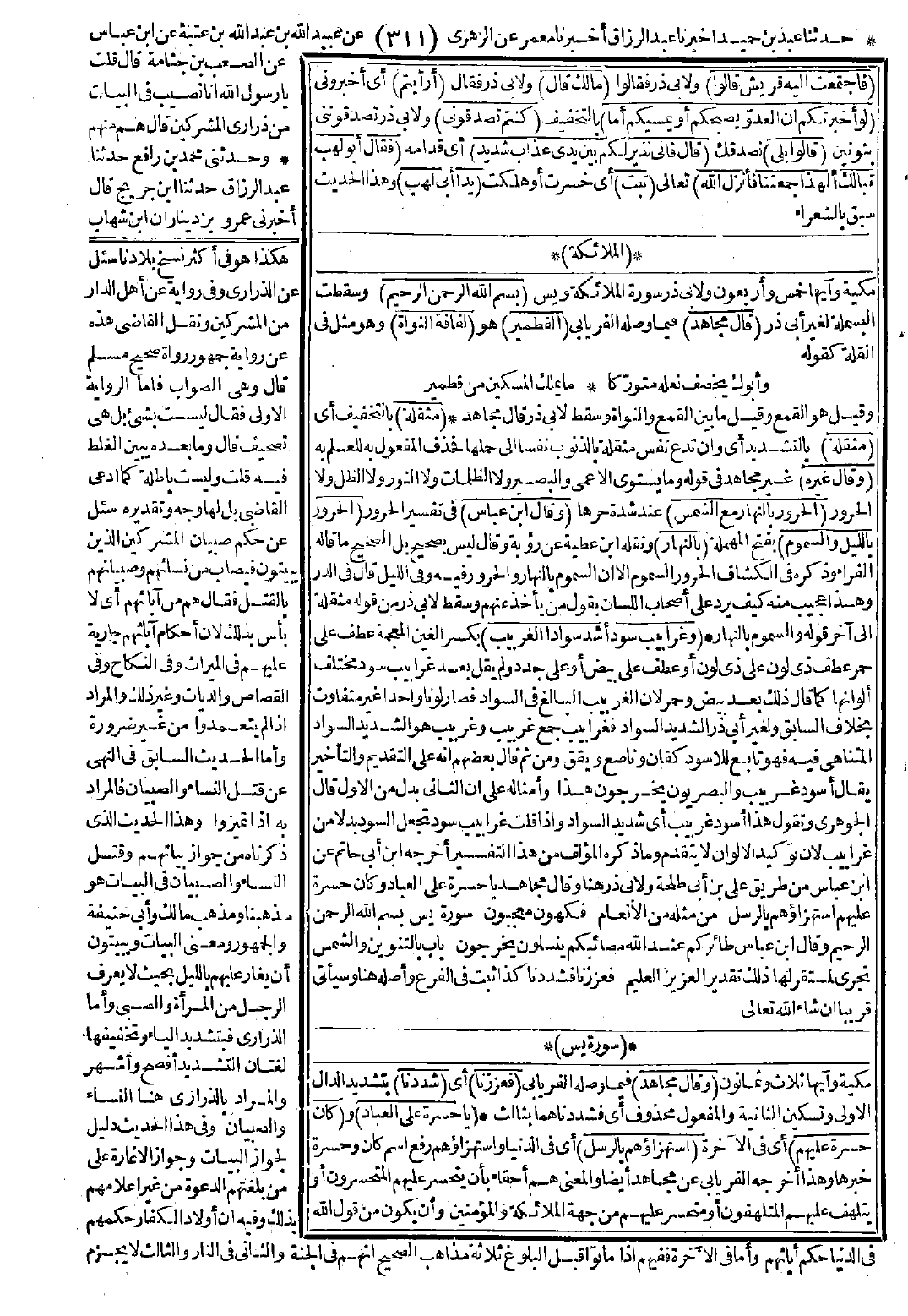(بِسْمِ اللهِ الرَّحْمَنِ الرَّحِيمِ) قَالَ مُجَاهِدٌ: الْقِطْمِيرُ لِفَافَةُ النَّوَاةِ. مُثْقَلَةٌ: مُثَقَّلَةٌ. وَقَالَ غَيْرُهُ: الْحَرُورُ بِالنَّهَارِ مَعَ الشَّمْسِ، وَقَالَ ابْنُ عَبَّاسٍ الْحَرُورُ بِاللَّيْلِ وَالسَّمُومُ بِالنَّهَارِ. وَغَرَابِيبُ سُودٌ أَشَدُّ سَوَادٍ الْغِرْبِيبُ.