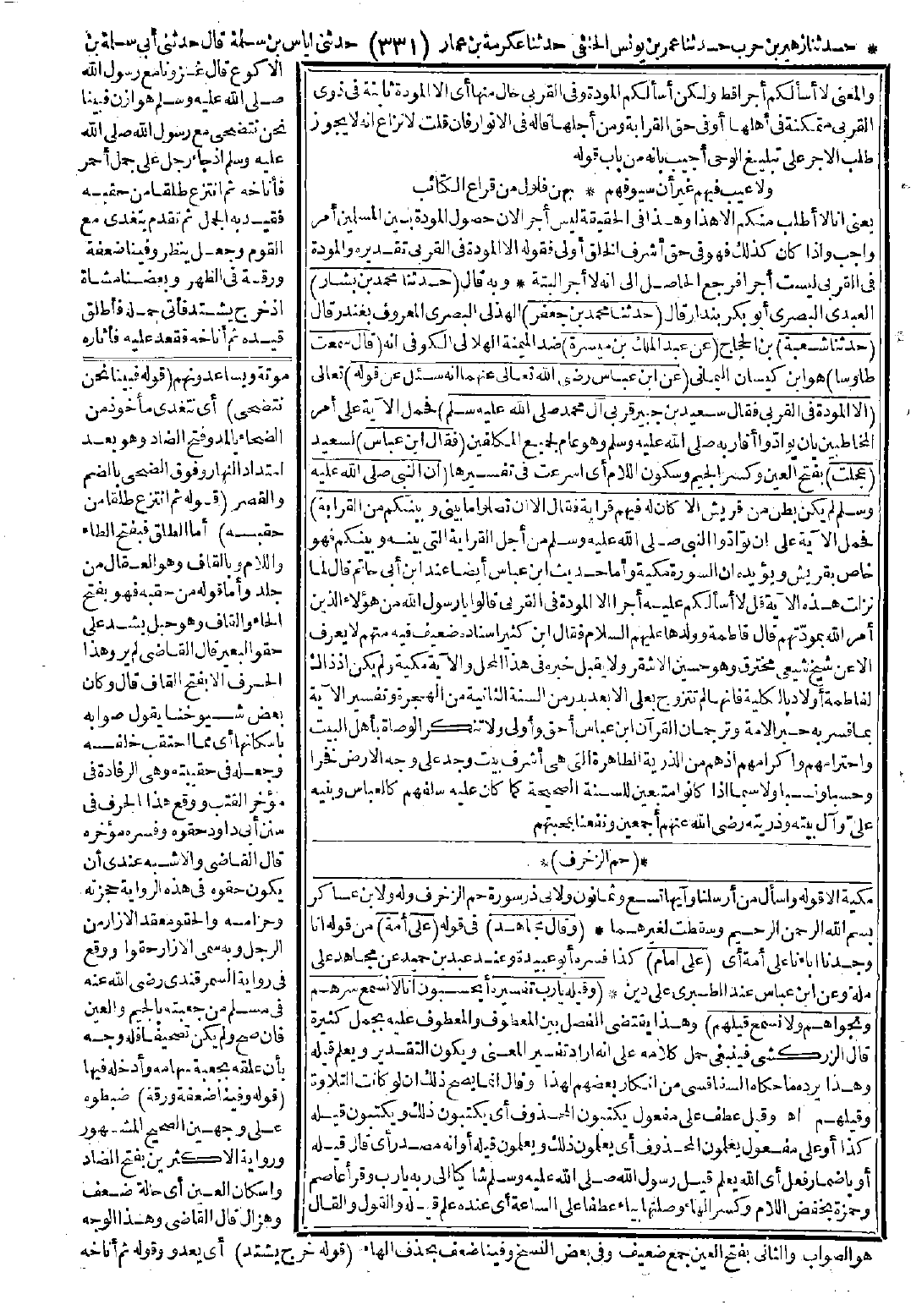 4818 - حَدَّثَنَا مُحَمَّدُ بْنُ بَشَّارٍ، حَدَّثَنَا مُحَمَّدُ بْنُ جَعْفَرٍ، حَدَّثَنَا شُعْبَةُ عَنْ عَبْدِ الْمَلِكِ بْنِ مَيْسَرَةَ قَالَ: سَمِعْتُ طَاوُسًا عَنِ ابْنِ عَبَّاسٍ: -رضي الله عنهما- أَنَّهُ سُئِلَ عَنْ قَوْلِهِ: {إِلاَّ الْمَوَدَّةَ فِي الْقُرْبَى} [الشورى: 23] فَقَالَ سَعِيدُ بْنُ جُبَيْرٍ: قُرْبَى آلِ مُحَمَّدٍ -صَلَّى اللَّهُ عَلَيْهِ وَسَلَّمَ-، فَقَالَ ابْنُ عَبَّاسٍ: عَجِلْتَ، إِنَّ النَّبِيَّ -صَلَّى اللَّهُ عَلَيْهِ وَسَلَّمَ- لَمْ يَكُنْ بَطْنٌ مِنْ قُرَيْشٍ إِلاَّ كَانَ لَهُ فِيهِمْ قَرَابَةٌ، فَقَالَ: "إِلاَّ أَنْ تَصِلُوا مَا بَيْنِي وَبَيْنَكُمْ مِنَ الْقَرَابَةِ".