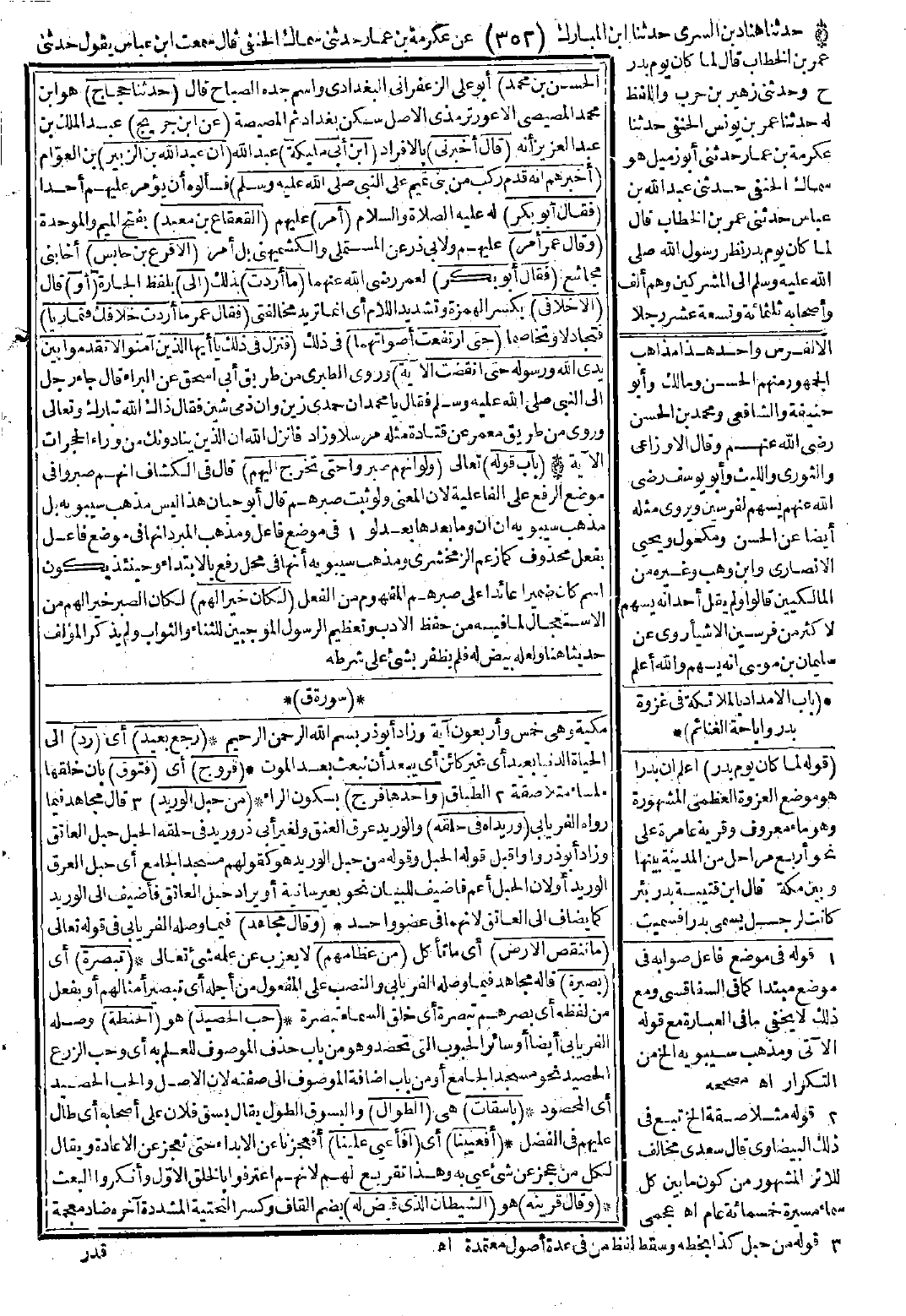{رَجْعٌ بَعِيدٌ}: رَدٌّ. {فُرُوجٍ}: فُتُوقٍ وَاحِدُهَا فَرْجٌ. {مِنْ حَبْلِ الوَرِيدِ}: وَرِيدَاهُ فِي حَلْقِهِ. وَقَالَ مُجَاهِدٌ {مَا تَنْقُصُ الأَرْضُ}: مِنْ عِظَامِهِمْ. {تَبْصِرَةً}: بَصِيرَةً. {حَبَّ الْحَصِيدِ}: الْحِنْطَةُ. {بَاسِقَاتٍ}: الطِّوَالُ. {أَفَعَيِينَا}: أَفَأَعْيَي عَلَيْنَا. {وَقَالَ قَرِينُهُ}: الشَّيْطَانُ الَّذِي قُيِّضَ لَهُ. {فَنَقَّبُوا}: ضَرَبُوا. {أَوْ أَلْقَى السَّمْعَ}: لاَ يُحَدِّثُ نَفْسَهُ بِغَيْرِهِ. حِينَ أَنْشَأَكُمْ وَأَنْشَأَ خَلْقَكُمْ {رَقِيبٌ عَتِيدٌ}: رَصَدٌ. {سَائِقٌ وَشَهِيدٌ}: الْمَلَكَانِ. {كَاتِبٌ وَشَهِيدٌ}: شَهِيدٌ شَاهِدٌ بِالْقَلْبِ. {لُغُوبٍ}: النَّصَبُ. وَقَالَ غَيْرُهُ {نَضِيدٌ}: الْكُفُرَّى مَا دَامَ فِي أَكْمَامِهِ وَمَعْنَاهُ مَنْضُودٌ بَعْضُهُ عَلَى بَعْضٍ فَإِذَا خَرَجَ مِنْ أَكْمَامِهِ فَلَيْسَ بِنَضِيدٍ. فِي {أَدْبَارِ النُّجُومِ وَأَدْبَارِ السُّجُودِ} كَانَ عَاصِمٌ يَفْتَحُ الَّتِي فِي ق وَيَكْسِرُ الَّتِي فِي الطُّورِ وَيُكْسَرَانِ جَمِيعًا وَيُنْصَبَانِ. وَقَالَ ابْنُ عَبَّاسٍ: {يَوْمَ الْخُرُوجِ}: يَخْرُجُونَ مِنَ الْقُبُورِ.