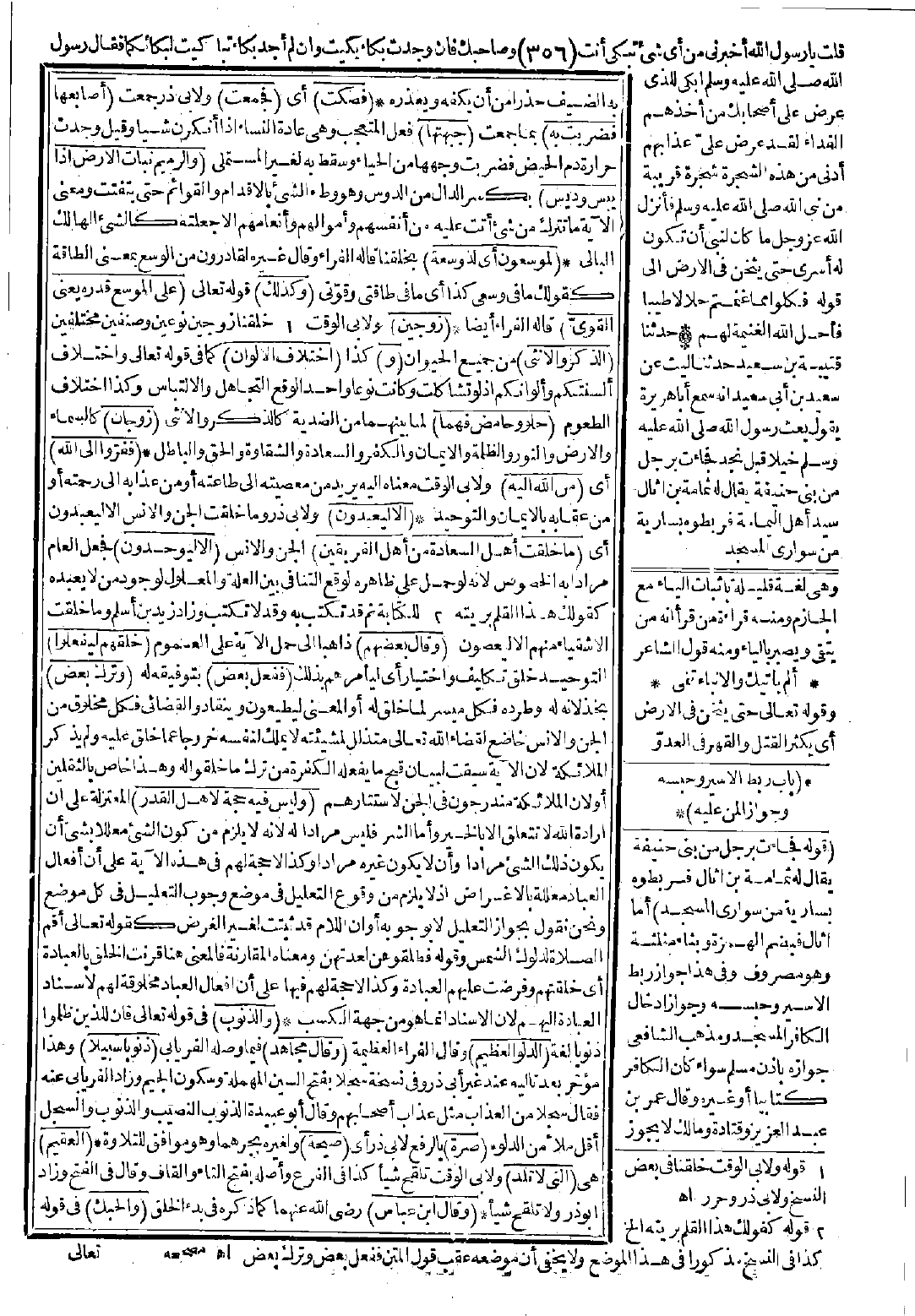 (وقال بعضهم): ذاهبًا إلى حمل الآية على العموم (خلقهم ليفعلوا) التوحيد خلق تكليف واختيار أي ليأمرهم بذلك (ففعل بعض) بتوفيقه له (وترك بعض) بخذلانه له، وطرده فكلٌّ ميسر لما خلق له أو المعنى ليطيعون وينقادوا لقضائي فكلٌّ مخلوق من الجن والإنس خاضع لقضاء الله تعالى متذلل لمشيئته لا يملك لنفسه خروجًا عما خلق عليه، ولم يذكر الملائكة لأن الآية سيقت لبيان قبح ما يفعله الكفرة من ترك ما خلقوا له وهذا خاص بالثقلين أو لأن الملائكة مندرجون في الجن لاستتارهم (وليس فيه حجة لأهل القدر) المعتزلة على أن إرادة الله لا تتعلق إلا بالخير وأما الشر فليس مرادًا له لأن لا يلزم من كون الشيء معللًا بشيء أن يكون ذلك الشيء مرادًا وأن لا يكون غيره مرادًا وكذا لا حجة لهم في هذه الآية على أن أفعال العباد معللة بالأغراض إذ لا يلزم