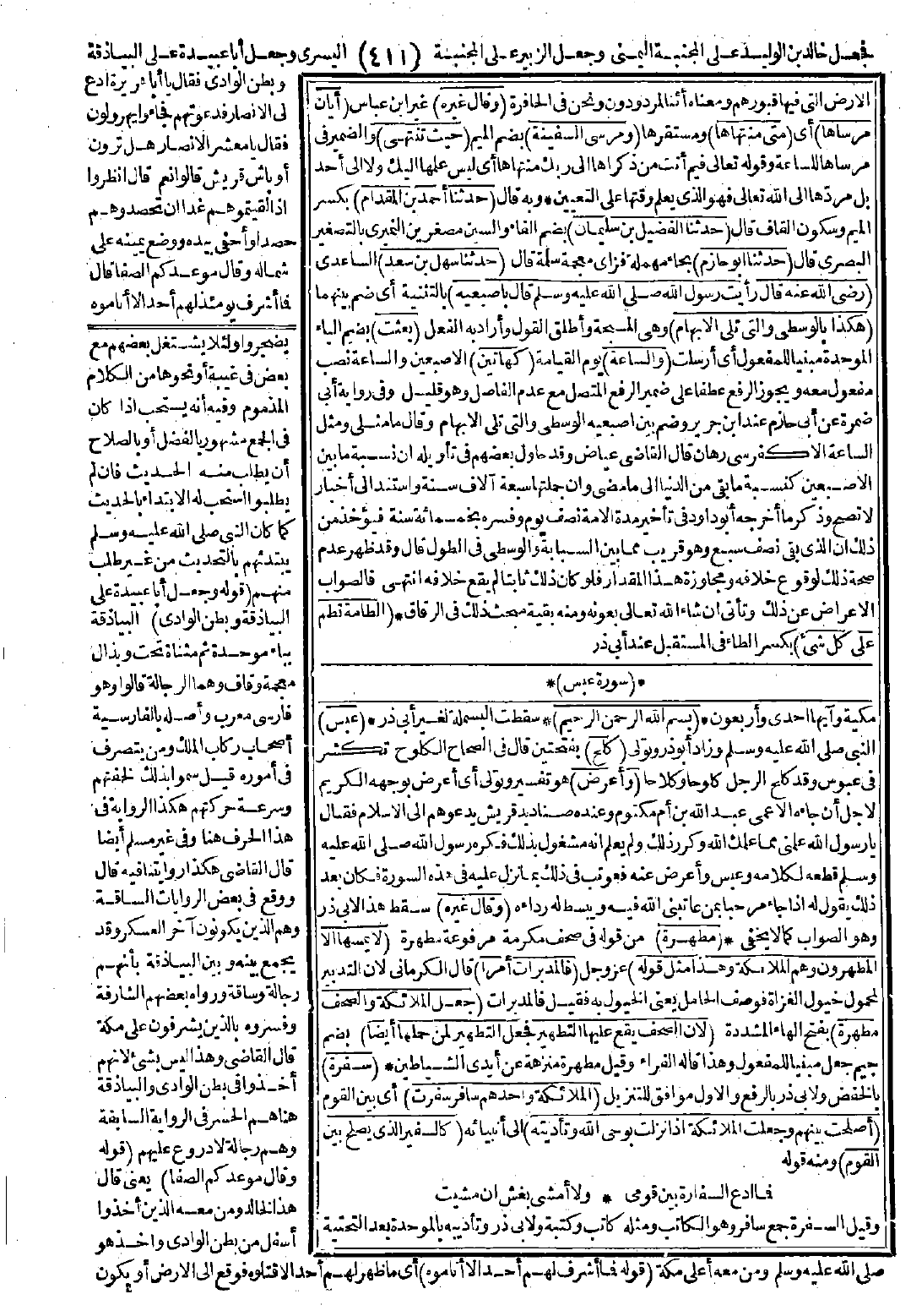 (بِسْمِ اللهِ الرَّحْمَنِ الرَّحِيمِ). {عَبَسَ}: كَلَحَ وَأَعْرَضَ. وَقَالَ غَيْرُهُ. {مُطَهَّرَةٍ}: لاَ يَمَسُّهَا إِلاَّ الْمُطَهَّرُونَ وَهُمُ الْمَلاَئِكَةُ. وَهَذَا مِثْلُ قَوْلِهِ {فَالْمُدَبِّرَاتِ أَمْرًا}: جَعَلَ الْمَلاَئِكَةَ وَالصُّحُفَ مُطَهَّرَةً لأَنَّ الصُّحُفَ يَقَعُ عَلَيْهَا التَّطْهِيرُ، فَجُعِلَ التَّطْهِيرُ لِمَنْ حَمَلَهَا أَيْضًا. {سَفَرَةٍ}: الْمَلاَئِكَةُ، وَاحِدُهُمْ سَافِرٌ، سَفَرْتُ أَصْلَحْتُ بَيْنَهُمْ، وَجُعِلَتِ الْمَلاَئِكَةُ إِذَا نَزَلَتْ بِوَحْيِ اللَّهِ وَتَأْدِيَتِهِ كَالسَّفِيرِ الَّذِي يُصْلِحُ بَيْنَ الْقَوْمِ وَقَالَ غَيْرُهُ تَصَدَّى: تَغَافَلَ عَنْهُ. وَقَالَ مُجَاهِدٌ {لَمَّا يَقْضِ}: لاَ يَقْضِ أَحَدٌ مَا أُمِرَ بِهِ. وَقَالَ ابْنُ عَبَّاسٍ {تَرْهَقُهَا}: تَغْشَاهَا شِدَّةٌ. {مُسْفِرَةٌ}: مُشْرِقَةٌ. {بِأَيْدِي سَفَرَةٍ} وَقَالَ ابْنُ عَبَّاسٍ: كَتَبَةٍ. {أَسْفَارًا}: كُتُبًا. {تَلَهَّى}: تَشَاغَلَ. يُقَالُ وَاحِدُ الأَسْفَارِ سِفْرٌ.