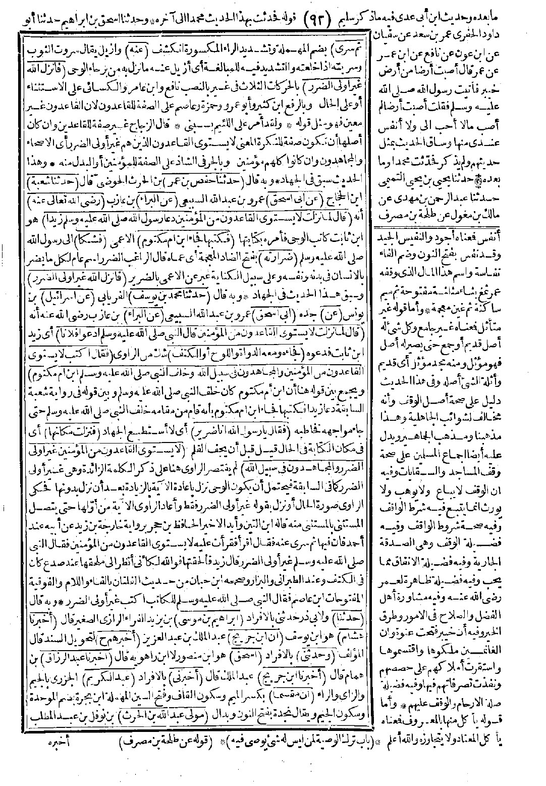 4593 - حَدَّثَنَي حَفْصُ بْنُ عُمَرَ، حَدَّثَنَا شُعْبَةُ، عَنْ أَبِي إِسْحَاقَ عَنِ الْبَرَاءِ -رضي الله عنه- قَالَ: لَمَّا نَزَلَتْ {لاَ يَسْتَوِي الْقَاعِدُونَ مِنَ الْمُؤْمِنِينَ} دَعَا رَسُولُ اللَّهِ -صَلَّى اللَّهُ عَلَيْهِ وَسَلَّمَ- زَيْدًا فَكَتَبَهَا فَجَاءَ ابْنُ أُمِّ مَكْتُومٍ فَشَكَا ضَرَارَتَهُ فَأَنْزَلَ اللَّهُ {غَيْرَ أُولِي الضَّرَرِ}.