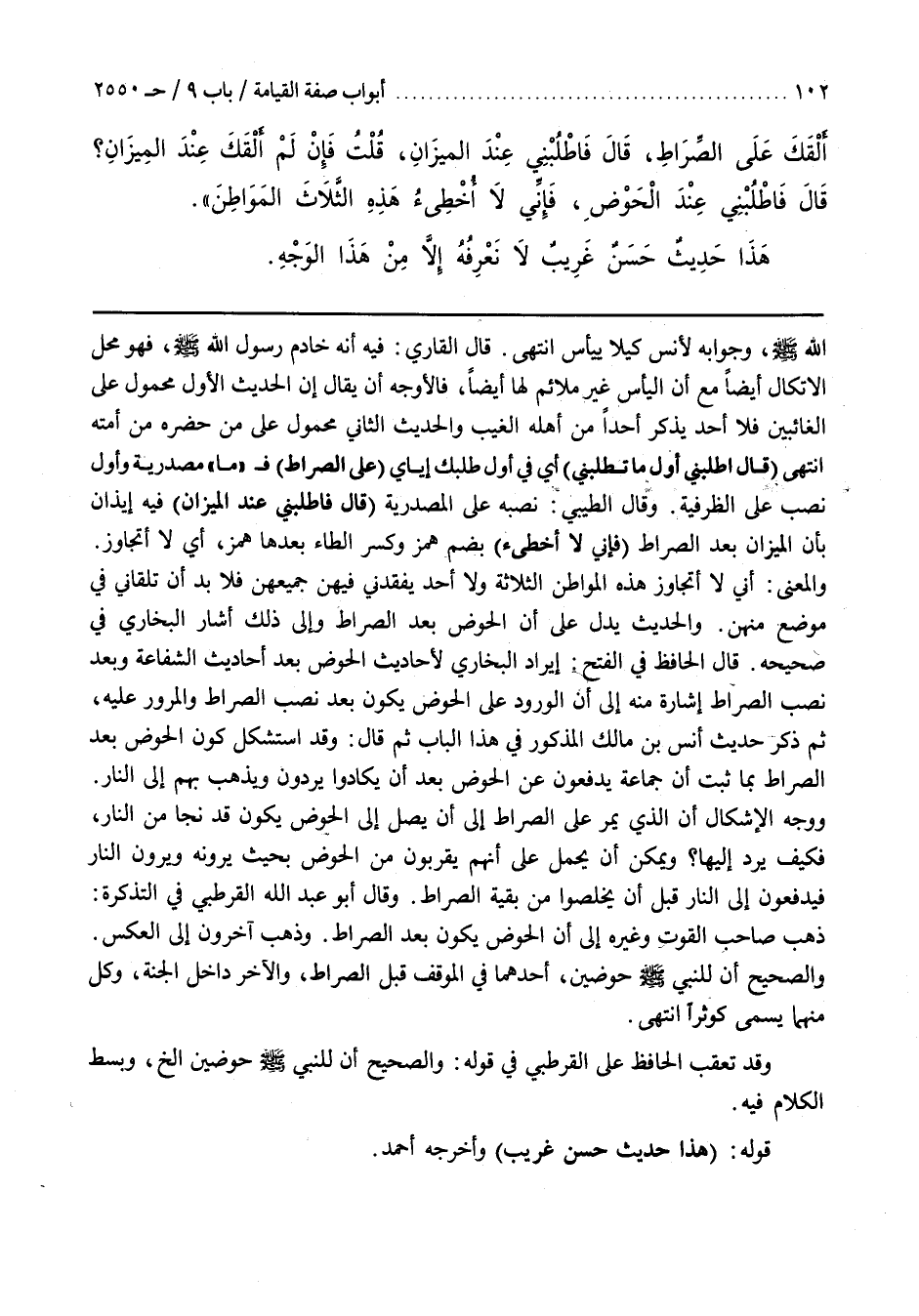 قَالَ الْحَافِظُ فِي الْفَتْحِ إِيرَادُ الْبُخَارِيِّ لِأَحَادِيثِ الْحَوْضِ بَعْدَ أَحَادِيثِ الشَّفَاعَةِ وَبَعْدَ نَصْبِ الصِّرَاطِ إِشَارَةٌ مِنْهُ إِلَى أَنَّ الْوُرُودَ عَلَى الْحَوْضِ يَكُونُ بَعْدَ نَصْبِ الصِّرَاطِ وَالْمُرُورِ عَلَيْهِ ثُمَّ ذَكَرَ حَدِيثَ أَنَسِ بْنِ مَالِكٍ الْمَذْكُورِ فِي هَذَا الْبَابِ ثُمَّ قَالَ وَقَدِ اسْتَشْكَلَ كَوْنُ الْحَوْضِ بَعْدَ الصِّرَاطِ بِمَا ثَبَتَ أَنَّ جَمَاعَةً يُدْفَعُونَ عَنِ الْحَوْضِ بَعْدَ أَنْ يَكَادُوا يَرِدُونَ وَيُذْهَبُ بِهِمْ إِلَى النَّارِ