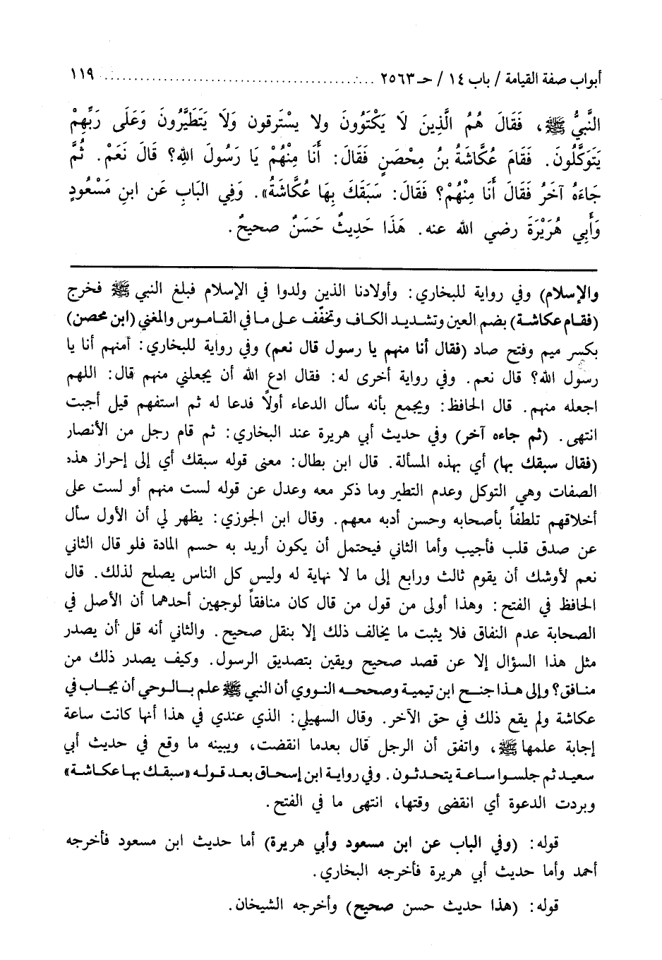 وَالْإِسْلَامِ) وَفِي رِوَايَةٍ لِلْبُخَارِيِّ وَأَوْلَادُنَا الَّذِينَ وُلِدُوا في الاسلام فإنا ولدنا في الجاهلية (فخرج النَّبِيِّ صَلَّى اللَّهُ عَلَيْهِ وَسَلَّمَ) وَفِي رِوَايَةِ للبخاري فَبَلَغَ النَّبِيَّ صَلَّى اللَّهُ عَلَيْهِ وَسَلَّمَ فَخَرَجَ (فَقَامَ عُكَّاشَةُ) بِضَمِّ الْعَيْنِ وَتَشْدِيدِ الْكَافِ وَتَخْفِيفٍ على ما في القاموس والمعنى (بن مِحْصَنٍ) بِكَسْرِ مِيمٍ وَفَتْحِ صَادٍ (فَقَالَ أَنَا منهم يا رسول قَالَ نَعَمْ) وَفِي رِوَايَةٍ لِلْبُخَارِيِّ أَمِنْهُمْ أَنَا يَا رَسُولَ اللَّهِ قَالَ نَعَمْ