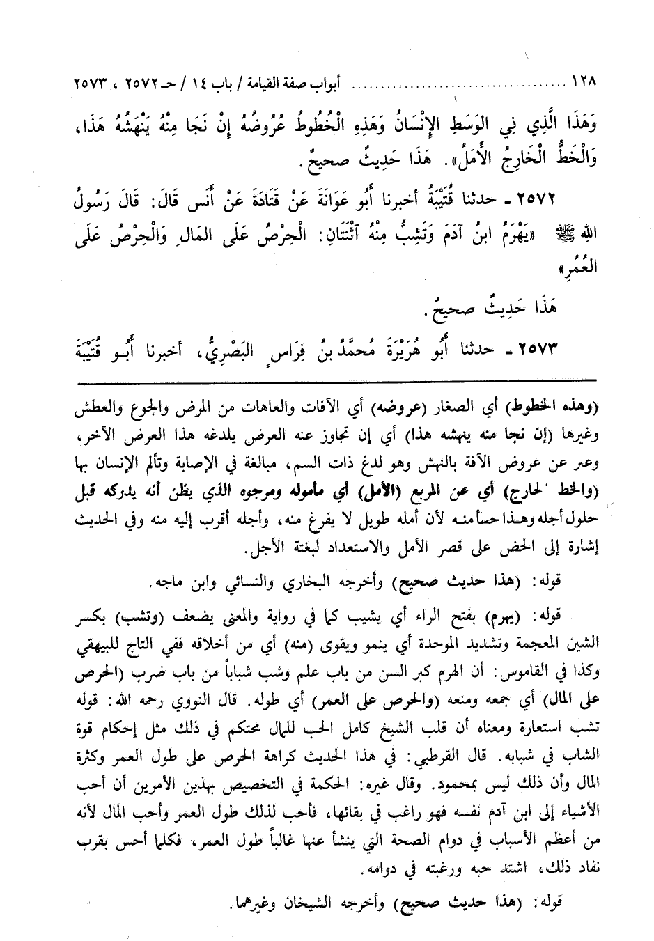 [2455] قَوْلُهُ (يَهْرَمُ) بِفَتْحِ الرَّاءِ أَيْ يَشِيبُ كَمَا فِي رِوَايَةٍ وَالْمَعْنَى يَضْعُفُ (وَيَشِبُّ) بِكَسْرِ الشِّينِ الْمُعْجَمَةِ وَتَشْدِيدِ الْمُوَحَّدَةِ أَيْ يَنْمُو وَيَقْوَى (مِنْهُ) أَيْ مِنْ أَخْلَاقِهِ فَفِي التَّاجِ لِلْبَيْهَقِيِّ وَكَذَا فِي الْقَامُوسِ أَنَّ الْهَرَمَ كِبَرُ السِّنِّ مِنْ بَابِ عَلِمَ وَشَبَّ شَبَابًا مِنْ بَابِ ضَرَبَ (الْحِرْصُ عَلَى الْمَالِ) أَيْ جَمْعِهِ وَمَنْعِهِ (وَالْحِرْصُ عَلَى الْعُمُرِ) أَيْ طُولِهِ
