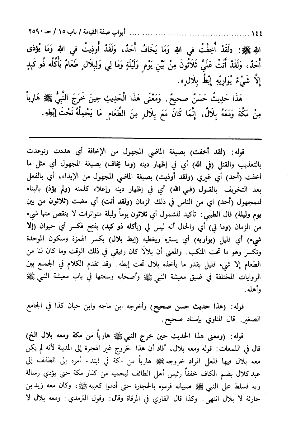 قَوْلُهُ (لَقَدْ أُخِفْتُ) بِصِيغَةِ الْمَاضِي الْمَجْهُولِ مِنَ الْإِخَافَةِ أَيْ هُدِّدْتُ وَتُوُعِّدْتُ بِالتَّعْذِيبِ وَالْقَتْلِ (فِي اللَّهِ) أَيْ فِي إِظْهَارِ دِينِهِ (وَمَا يُخَافُ) بِصِيغَةِ الْمَجْهُولِ أَيْ مِثْلَ مَا أُخِفْتُ (أَحَدٌ) أَيْ غَيْرِي (وَلَقَدْ أُوذِيتُ) بِصِيغَةِ الْمَاضِي الْمَجْهُولِ مِنَ الْإِيذَاءِ أَيْ بِالْفِعْلِ بَعْدَ التَّخْوِيفِ بِالْقَوْلِ (فِي اللَّهِ) أَيْ فِي إِظْهَارِ دِينِهِ وَإِعْلَاءِ كَلِمَتِهِ (وَلَمْ يُؤْذَ) بِالْبِنَاءِ لِلْمَجْهُولِ (أَحَدٌ) أَيْ مِنَ النَّاسِ فِي ذَلِكَ الزَّمَانِ (وَلَقَدْ أَتَتْ) أَيْ مَضَتْ (ثَلَاثُونَ مِنْ بَيْنِ يَوْمٍ وَلَيْلَةٍ) قَالَ الطِّيبِيُّ تَأْكِيدٌ لِلشُّمُولِ أَيْ ثَلَاثِينَ يَوْمًا وَلَيْلَةً مُتَوَاتِرَاتٍ لَا يَنْقُصُ مِنْهَا شَيْءٌ مِنَ الزمان (ومالي) أَيْ وَالْحَالُ أَنَّهُ لَيْسَ لِي (يَأْكُلُهُ ذُو كَبِدٍ) بِفَتْحٍ فَكَسْرٍ أَيْ حَيَوَانٌ (إِلَّا شَيْءٌ) أَيْ قَلِيلٌ (يُوَارِيهِ) أَيْ يَسْتُرُهُ وَيُغَطِّيهِ (إِبْطُ بِلَالٍ) بِكَسْرِ الْهَمْزَةِ وَسُكُونِ الْمُوَحَّدَةِ وَتُكْسَرُ وَهُوَ مَا تَحْتَ الْمَنْكِبِ
