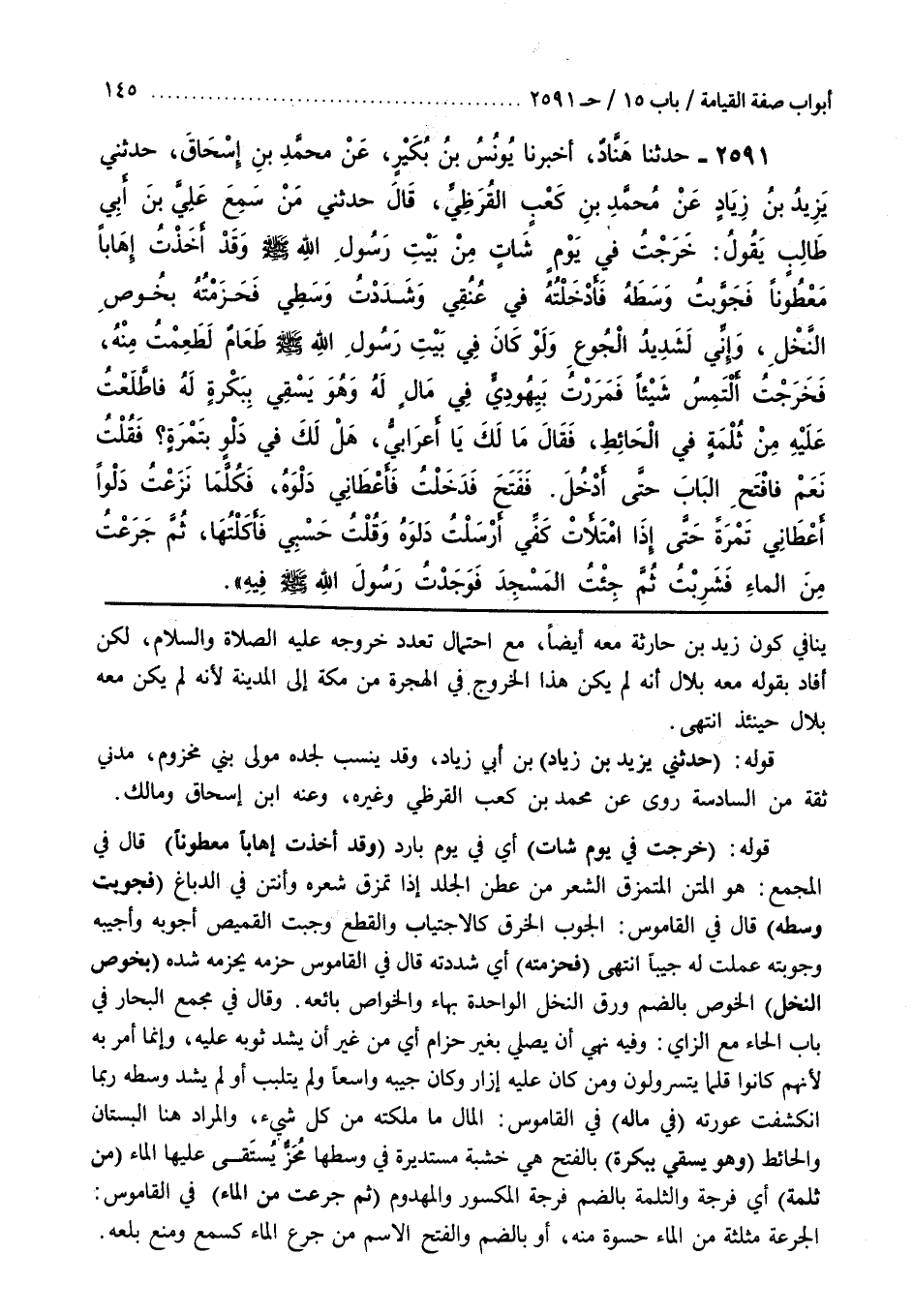 [2473] قَوْلُهُ (خَرَجْتُ فِي يَوْمٍ شَاتٍ) أَيْ فِي يَوْمٍ بَارِدٍ (وَقَدْ أَخَذْتُ إِهَابًا مَعْطُونًا) قَالَ فِي الْمَجْمَعِ هُوَ الْمَتْنُ الْمُتَمَزِّقُ الشَّعْرِ مِنْ عَطِنَ الْجِلْدُ إِذَا تَمَزَّقَ شَعْرُهُ وَأَنْتَنَ فِي الدِّبَاغِ (فَجَوَّبْتُ وَسَطَهُ) قَالَ فِي الْقَامُوسِ الْجَوْبُ الْخَرْقُ كَالِاجْتِيَابِ وَالْقَطْعِ وَجُبْتُ الْقَمِيصَ أَجُوبُهُ وَأُجِيبُهُ وَجَوَّبْتُهُ عَمِلْتُ لَهُ جَيْبًا انْتَهَى (فخزمته) أَيْ شَدَدْتُهُ قَالَ فِي الْقَامُوسِ حَزَمَهُ يَحْزِمُهُ شَدَّهُ (بِخُوصِ النَّخْلِ) الْخُوصُ بِالضَّمِّ وَرَقُ النَّخْلِ الْوَاحِدَةُ بِهَاءٍ وَالْخَوَّاصُ بَائِعُهُ