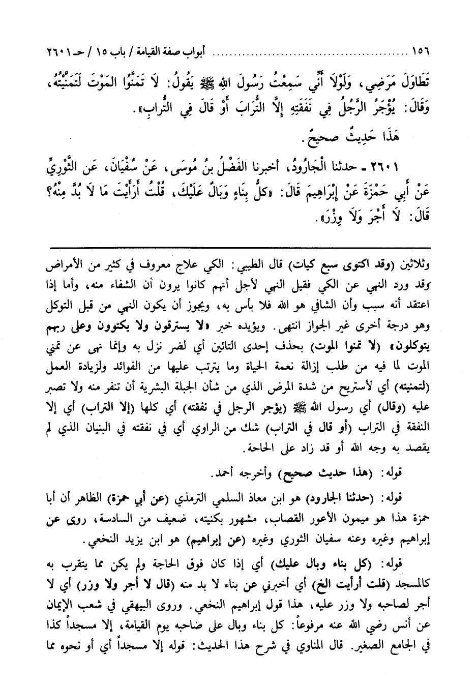 ويُؤَيِّدُهُ خَبَرُ لَا يَسْتَرْقُونَ وَلَا يَكْتَوُونَ وَعَلَى رَبِّهِمْ يَتَوَكَّلُونَ (لَا تمنوا الموت) بحذف إحدى التائين أَيْ لِضُرٍّ نَزَلَ بِهِ وَإِنَّمَا نُهِيَ عَنْ تَمَنِّي الْمَوْتِ لِمَا فِيهِ مِنْ طَلَبِ إِزَالَةِ نِعْمَةِ الْحَيَاةِ وَمَا يَتَرَتَّبُ عَلَيْهَا مِنَ الْفَوَائِدِ ولزيادة العمل (لتنميته) أَيْ لِأَسْتَرِيحَ مِنْ شِدَّةِ الْمَرَضِ الَّذِي مِنْ شَأْنِ الْجِبِلَّةِ الْبَشَرِيَّةِ أَنْ تَنْفِرَ مِنْهُ وَلَا تَصْبِرَ عَلَيْهِ (وَقَالَ) أَيْ رَسُولُ اللَّهِ صَلَّى اللَّهُ عَلَيْهِ وَسَلَّمَ (يُؤْجَرُ الرَّجُلُ فِي نَفَقَتِهِ) أَيْ كُلِّهَا (إِلَّا التُّرَابَ) أَيْ إِلَّا النَّفَقَةَ فِي التُّرَابِ (أَوْ قَالَ فِي التُّرَابِ) شَكٌّ من الرواي أَيْ فِي نَفَقَتِهِ فِي الْبُنْيَانِ الَّذِي لَمْ يَقْصِدْ بِهِ وَجْهَ اللَّهِ أَوْ قَدْ زَادَ عَلَى الْحَاجَةِ