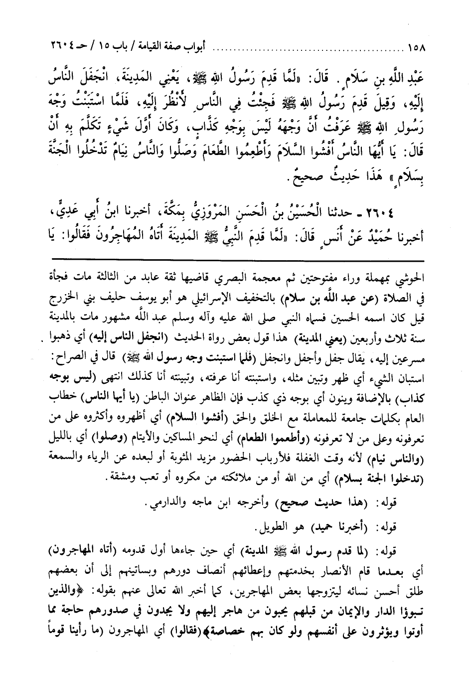 الحوشي بِمُهْمَلَةٍ وَرَاءٍ مَفْتُوحَتَيْنِ ثُمَّ مُعْجَمَةٍ الْبَصْرِيُّ قَاضِيهَا ثِقَةٌ عَابِدٌ مِنَ الثَّالِثَةِ مَاتَ فَجْأَةً [2485] فِي الصَّلَاةِ (عَنْ عَبْدِ اللَّهِ بْنِ سَلَامٍ) بِالتَّخْفِيفِ الْإِسْرَائِيلِيِّ هُوَ أَبُو يُوسُفَ حَلِيفُ بَنِي الْخَزْرَجِ قِيلَ كَانَ اسْمُهُ الْحُسَيْنَ فَسَمَّاهُ النَّبِيُّ صَلَّى اللَّهُ عَلَيْهِ وَسَلَّمَ عَبْدَ اللَّهِ مَشْهُورٌ مَاتَ بِالْمَدِينَةِ سَنَةَ ثَلَاثٍ وَأَرْبَعِينَ (يَعْنِي الْمَدِينَةَ) هَذَا قَوْلُ بَعْضِ رُوَاةِ الْحَدِيثِ (انْجَفَلَ النَّاسُ إِلَيْهِ) أَيْ ذَهَبُوا مُسْرِعِينَ إِلَيْهِ يُقَالُ جَفَلَ وَأَجْفَلَ وَانْجَفَلَ (فَلَمَّا اسْتَبَنْتُ وَجْهِ رَسُولِ اللَّهِ صَلَّى اللَّهُ عَلَيْهِ وَسَلَّمَ) قَالَ فِي الصُّرَاحِ اسْتَبَانَ الشَّيْءَ أَيْ ظَهَرَ وَتَبَيَّنَ مِثْلُهُ وَاسْتَبَنْتُهُ أَنَا عَرَفْتُهُ وَتَبَيَّنْتُهُ أَنَا كَذَلِكَ انْتَهَى (لَيْسَ بِوَجْهِ كذاب) بالإضافة وينون أي يوجه ذِي كَذِبٍ فَإِنَّ الظَّاهِرَ عِنْوَانُ الْبَاطِنِ (يَا أَيُّهَا النَّاسُ) خِطَابُ الْعَامِّ بِكَلِمَاتٍ جَامِعَةٍ لِلْمُعَامَلَةِ مَعَ الْخُلُقِ وَالْحَقِّ (أَفْشُوا السَّلَامَ) أَيْ أَظْهِرُوهُ وَأَكْثِرُوهُ عَلَى مَنْ تَعْرِفُونَهُ وَعَلَى مَنْ لَا تَعْرِفُونَهُ (وَأَطْعِمُوا الطَّعَامَ) أَيْ لِنَحْوِ الْمَسَاكِينِ وَالْأَيْتَامِ (وَصَلُّوا) أَيْ بِاللَّيْلِ (وَالنَّاسُ نِيَامٌ) لِأَنَّهُ وَقْتُ الْغَفْلَةِ فَلِأَرْبَابِ الْحُضُورِ مَزِيدُ الْمَثُوبَةِ أَوْ لِبُعْدِهِ عَنِ الرِّيَاءِ وَالسُّمْعَةِ (تَدْخُلُوا الْجَنَّةَ بِسَلَامٍ) أَيْ مِنَ اللَّهِ أَوْ مِنْ مَلَائِكَتِهِ مِنْ مَكْرُوهٍ أَوْ تَعَبٍ وَمَشَقَّةٍ