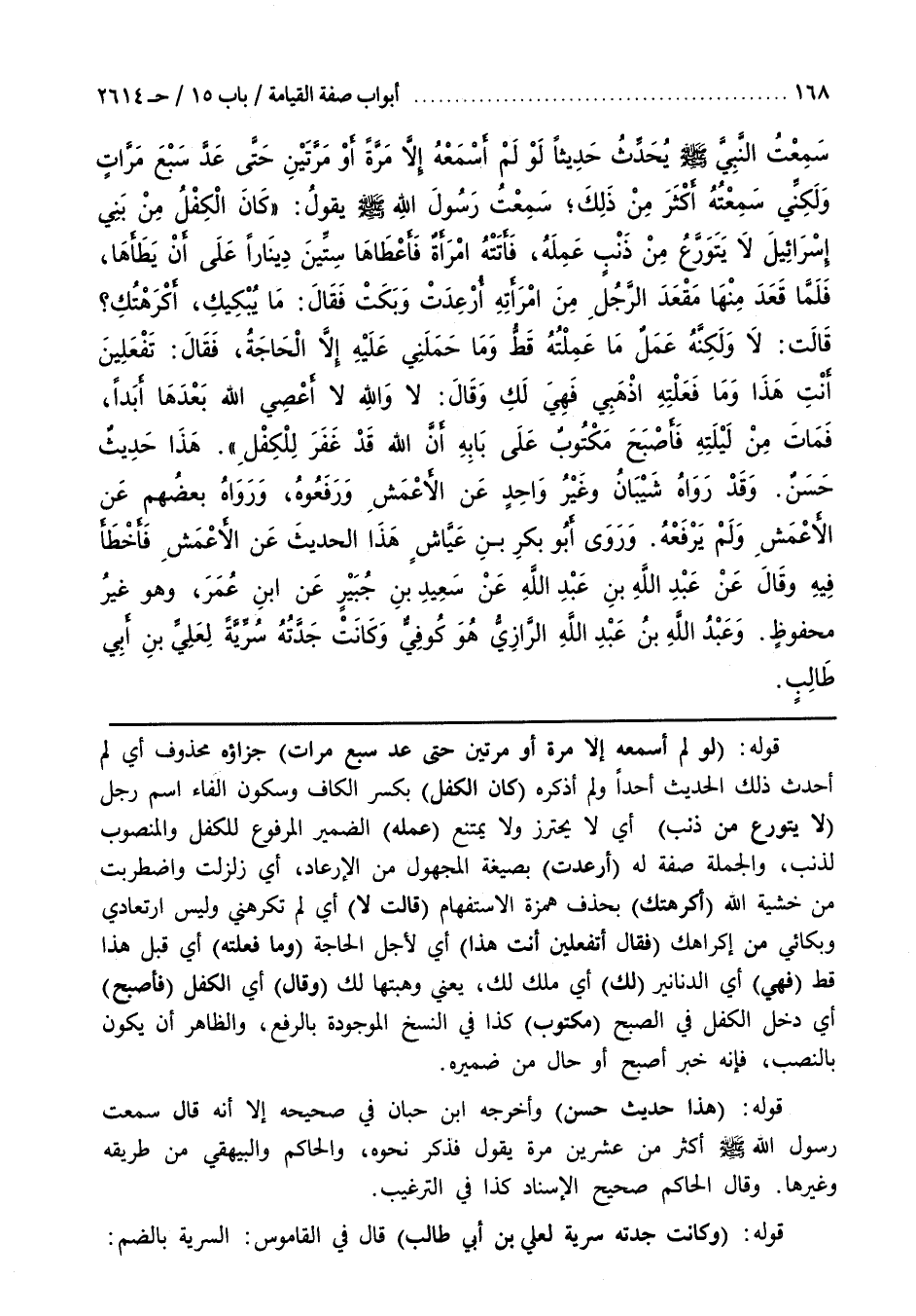 قَوْلُهُ (لَوْ لَمْ أَسْمَعْهُ إِلَّا مَرَّةً أَوْ مرتين حتى عد سبع مرات) جزاءه مَحْذُوفٌ أَيْ لَمْ أُحَدِّثْ ذَلِكَ الْحَدِيثَ أَحَدًا وَلَمْ أَذْكُرْهُ (كَانَ الْكِفْلُ) بِكَسْرِ الْكَافِ وَسُكُونِ الْفَاءِ اسْمُ رَجُلٍ (لَا يَتَوَرَّعُ مِنْ ذَنْبٍ) أَيْ لَا يَحْتَرِزُ وَلَا يَمْتَنِعُ (عَمِلَهُ) الضَّمِيرُ الْمَرْفُوعُ لِلْكِفْلِ وَالْمَنْصُوبُ لِذَنْبٍ وَالْجُمْلَةُ صِفَةٌ لَهُ (أُرْعِدَتْ) بِصِيغَةِ الْمَجْهُولِ مِنَ الْإِرْعَادِ أَيْ زُلْزِلَتْ واضطربت من خشية الله (أكرهتك) بحذف هَمْزَةَ الِاسْتِفْهَامِ (قَالَتْ لَا) أَيْ لَمْ تُكْرِهْنِي وَلَيْسَ ارْتِعَادِي وَبُكَائِي مِنْ إِكْرَاهِكَ (فَقَالَ أَتَفْعَلِينَ أَنْتِ هَذَا) أَيْ لِأَجْلِ الْحَاجَةِ (وَمَا فَعَلْتِهِ) أَيْ قَبْلَ هَذَا قَطُّ (فَهِيَ) أَيِ الدَّنَانِيرُ (لَكِ) أَيْ مِلْكٌ لَكِ يَعْنِي وَهَبْتُهَا لَكِ (وَقَالَ) أَيِ الْكِفْلُ (فَأَصْبَحَ) أَيْ دَخَلَ الْكِفْلُ في الصبح (مكتوب) كذا فِي النُّسَخِ الْمَوْجُودَةِ بِالرَّفْعِ وَالظَّاهِرُ أَنْ يَكُونَ بِالنَّصْبِ