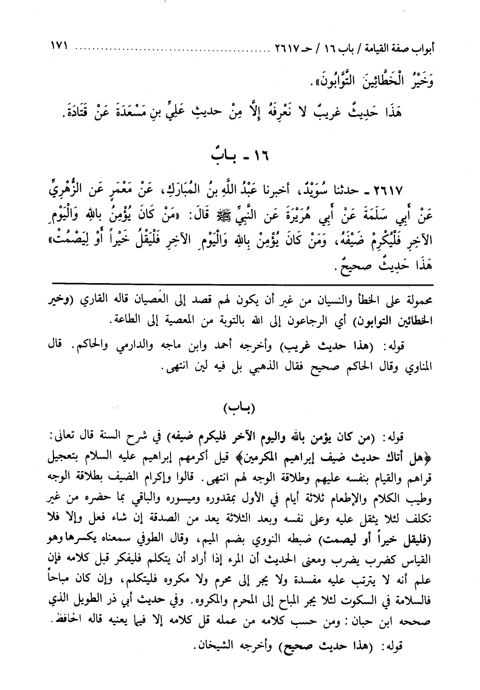 9 - باب [2500] قَوْلُهُ (مَنْ كَانَ يُؤْمِنُ بِاَللَّهِ وَالْيَوْمِ الْآخِرِ فَلْيُكْرِمْ ضَيْفَهُ) فِي شَرْحِ السُّنَّةِ قَالَ تَعَالَى هل أتاك حديث ضيف إبراهيم المكرمين قِيلَ أَكْرَمَهُمْ إِبْرَاهِيمُ عَلَيْهِ السَّلَامُ بِتَعْجِيلِ قِرَاهُمْ وَالْقِيَامِ بِنَفْسِهِ عَلَيْهِمْ وَطَلَاقَةِ الْوَجْهِ لَهُمْ انْتَهَى