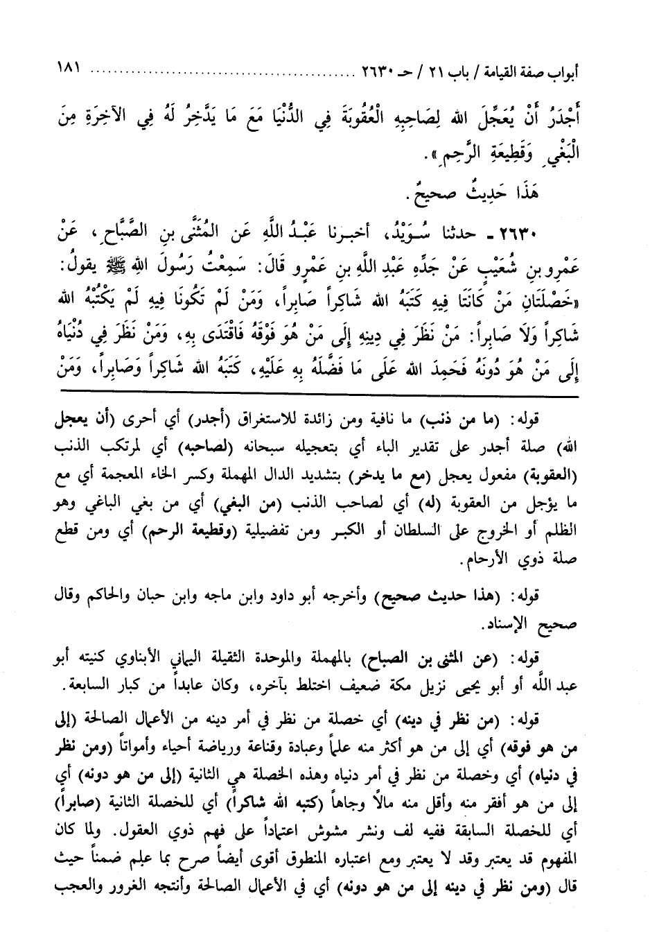 قَوْلُهُ (مَا مِنْ ذَنْبٍ) مَا نَافِيَةٌ وَمِنْ زَائِدَةٌ لِلِاسْتِغْرَاقِ (أَجْدَرُ) أَيْ أَحْرَى (أَنْ يُعَجِّلَ اللَّهُ) صِلَةُ أَجْدَرُ عَلَى تَقْدِيرِ الْبَاءِ أَيْ بِتَعْجِيلِهِ سُبْحَانَهُ (لِصَاحِبِهِ) أَيْ لِمُرْتَكِبِ الذَّنْبِ (الْعُقُوبَةَ) مَفْعُولُ يُعَجِّلَ (مَعَ مَا يَدَّخِرُ) بِتَشْدِيدِ الدَّالِ الْمُهْمَلَةِ وَكَسْرِ الْخَاءِ الْمُعْجَمَةِ أَيْ مَعَ مَا يُؤَجِّلُ مِنَ الْعُقُوبَةِ (لَهُ) أَيْ لِصَاحِبِ الذَّنْبِ (مِنَ الْبَغْيِ) أَيْ مِنْ بَغْيِ الْبَاغِي وَهُوَ الظلم أو الخروج على السلطان أو الكبرى ومن تَفْضِيلِيَّةٌ (وَقَطِيعَةِ الرَّحِمِ) أَيْ وَمِنْ قَطْعِ صِلَةِ ذوي الأرحام