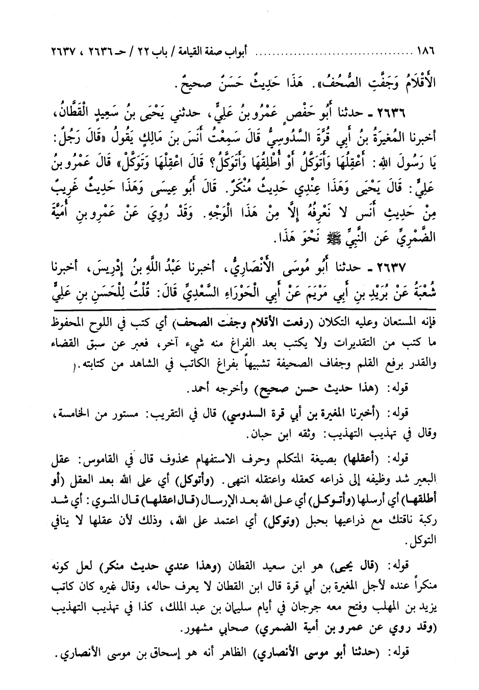 قَوْلُهُ (أَعْقِلُهَا) بِصِيغَةِ الْمُتَكَلِّمِ وَحَرْفُ الِاسْتِفْهَامِ مَحْذُوفٌ قَالَ فِي الْقَامُوسِ عَقَلَ الْبَعِيرَ شَدَّ وَظِيفَهُ إِلَى ذِرَاعِهِ كَعَقَلَهُ وَاعْتَقَلَهُ انْتَهَى (وَأَتَوَكَّلُ) أَيْ عَلَى اللَّهِ بَعْدَ الْعَقْلِ (أَوْ أُطْلِقُهَا) أي أرسها (وَأَتَوَكَّلُ) أَيْ عَلَى اللَّهِ بَعْدَ الْإِرْسَالِ (قَالَ اعْقِلْهَا) قَالَ الْمُنَاوِيُّ أَيْ شُدَّ رُكْبَةَ نَاقَتِكَ مَعَ ذِرَاعَيْهَا بِحَبْلٍ (وَتَوَكَّلْ) أَيِ اعْتَمِدْ عَلَى اللَّهِ وَذَلِكَ لِأَنَّ عَقْلَهَا لَا يُنَافِي التَّوَكُّلَ