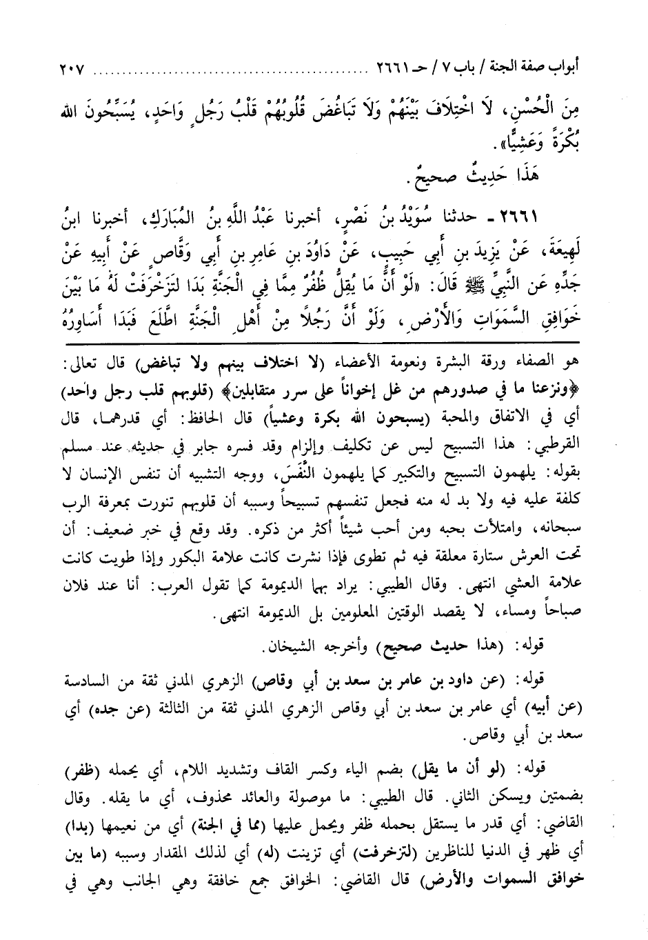 هُوَ الصَّفَاءُ وَرِقَّةُ الْبَشَرَةِ وَنُعُومَةُ الْأَعْضَاءِ لَا اخْتِلَافَ بَيْنَهُمْ وَلَا تَبَاغُضَ قَالَ تَعَالَى وَنَزَعْنَا مَا فِي صُدُورِهِمْ مِنْ غِلٍّ إِخْوَانًا عَلَى سرر متقابلين (قُلُوبُهُمْ قَلْبُ رَجُلٍ وَاحِدٍ) أَيْ فِي الِاتِّفَاقِ وَالْمَحَبَّةِ (يُسَبِّحُونَ اللَّهَ بُكْرَةً وَعَشِيًّا) قَالَ الْحَافِظُ أَيْ قَدْرَهُمَا قَالَ الْقُرْطُبِيُّ هَذَا التَّسْبِيحُ لَيْسَ عَنْ تَكْلِيفٍ وَإِلْزَامٍ وَقَدْ فَسَّرَهُ جَابِرٌ فِي حَدِيثِهِ عِنْدَ مُسْلِمٍ بِقَوْلِهِ يُلْهَمُونَ التَّسْبِيحَ وَالتَّكْبِيرَ كَمَا يُلْهَمُونَ النَّفَسَ وَوَجْهُ التَّشْبِيهِ أَنَّ تَنَفُّسَ الْإِنْسَانِ لَا كُلْفَةَ عَلَيْهِ فِيهِ وَلَا بُدَّ لَهُ مِنْهُ فَجُعِلَ تَنَفُّسُهُمْ تَسْبِيحًا وَسَبَبُهُ أَنَّ قُلُوبَهُمْ تَنَوَّرَتْ بِمَعْرِفَةِ الرَّبِّ سُبْحَانَهُ وَامْتَلَأَتْ بِحُبِّهِ وَمَنْ أَحَبَّ شَيْئًا أَكْثَرَ مِنْ ذِكْرِهِ