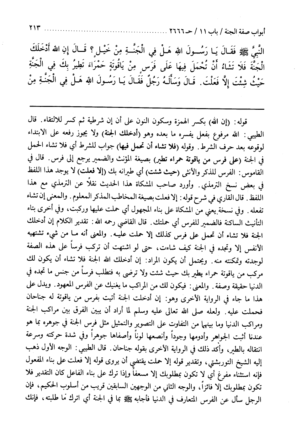 وَلَعَلَّهُ صَلَّى اللَّهُ عَلَيْهِ وَسَلَّمَ لَمَّا أَرَادَ أَنْ يُبَيِّنَ الْفَرْقَ بَيْنَ مَرَاكِبِ الْجَنَّةِ وَمَرَاكِبِ الدُّنْيَا وَمَا بَيْنَهُمَا مِنَ التَّفَاوُتِ عَلَى التَّصْوِيرِ وَالتَّمْثِيلِ مَثَّلَ فَرَسَ الْجَنَّةِ فِي جَوْهَرِهِ بِمَا هُوَ عِنْدَنَا أَثْبَتُ الْجَوَاهِرِ وَأَدُومُهَا وُجُودًا وَأَنْصَعُهَا لَوْنًا وَأَصْفَاهَا جَوْهَرًا وَفِي شِدَّةِ حَرَكَتِهِ وَسُرْعَةِ انْتِقَالِهِ بِالطَّيْرِ وَأَكَّدَ ذَلِكَ فِي الرِّوَايَةِ الْأُخْرَى بِقَوْلِهِ جَنَاحَانِ