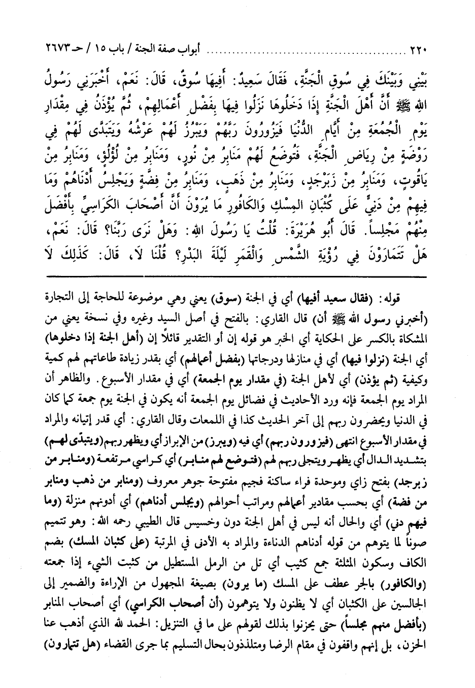 قَوْلُهُ (فَقَالَ سَعِيدٌ أَفِيهَا) أَيْ فِي الْجَنَّةِ (سُوقٌ) يَعْنِي وَهِيَ مَوْضُوعَةٌ لِلْحَاجَةِ إِلَى التِّجَارَةِ (أَخْبَرَنِي رَسُولُ اللَّهِ صَلَّى اللَّهُ عَلَيْهِ وَسَلَّمَ أن) قال القارىء بِالْفَتْحِ فِي أَصْلِ السَّيِّدِ وَغَيْرِهِ وَفِي نُسْخَةٍ يَعْنِي مِنَ الْمِشْكَاةِ بِالْكَسْرِ عَلَى الْحِكَايَةِ أَيِ الخبر هو قوله إن أو التقدير قَائِلًا إِنَّ (أَهْلَ الْجَنَّةِ إِذَا دَخَلُوهَا) أَيِ الْجَنَّةَ (نَزَلُوا فِيهَا) أَيْ فِي مَنَازِلِهَا وَدَرَجَاتِهَا (بِفَضْلِ أَعْمَالِهِمْ) أَيْ بِقَدْرِ زِيَادَةِ طَاعَاتِهِمْ لَهُمْ كَمِّيَّةً وَكَيْفِيَّةً (ثُمَّ يُؤْذَنُ) أَيْ لِأَهْلِ الْجَنَّةِ (فِي مِقْدَارِ يَوْمِ الْجُمُعَةِ) أَيْ فِي مِقْدَارِ الْأُسْبُوعِ