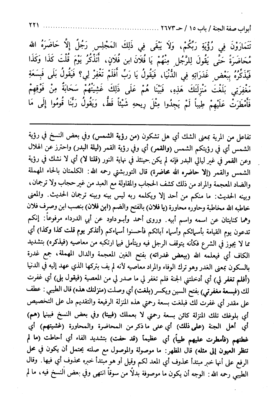 تَفَاعُلٌ مِنَ الْمِرْيَةِ بِمَعْنَى الشَّكِّ أَيْ هَلْ تَشُكُّونَ (مِنْ رُؤْيَةِ الشَّمْسِ) وَفِي بَعْضِ النُّسَخِ فِي رُؤْيَةِ الشَّمْسِ أَيْ فِي رُؤْيَتِكُمُ الشَّمْسَ (وَالْقَمَرِ) أَيْ وَفِي رُؤْيَةِ الْقَمَرِ (لَيْلَةَ الْبَدْرِ) وَاحْتَرَزَ عَنِ الْهِلَالِ وَعَنِ الْقَمَرِ فِي غَيْرِ لَيَالِي الْبَدْرِ فَإِنَّهُ لَمْ يَكُنْ حِينَئِذٍ فِي نِهَايَةِ النُّورِ (قُلْنَا لَا) أَيْ لَا نَشُكُّ فِي رُؤْيَةِ الشَّمْسِ وَالْقَمَرِ (إِلَّا حَاضَرَهُ اللَّهُ مُحَاضَرَةً) قَالَ التُّورْبَشْتِيُّ رَحِمَهُ اللَّهُ الْكَلِمَتَانِ بِالْحَاءِ الْمُهْمَلَةِ وَالضَّادِ الْمُعْجَمَةِ وَالْمُرَادُ مِنْ ذَلِكَ كَشْفُ الْحِجَابِ وَالْمُقَاوَلَةُ مَعَ الْعَبْدِ مِنْ غَيْرِ حِجَابٍ وَلَا تُرْجُمَانٍ وَمِنْهُ الْحَدِيثُ مَا مِنْكُمْ مِنْ أَحَدٍ إِلَّا وَيُكَلِّمُهُ رَبُّهُ لَيْسَ بَيْنَهُ وَبَيْنَهُ تُرْجُمَانٌ الْحَدِيثَ