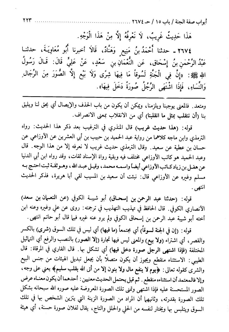 قَوْلُهُ (إِنَّ فِي الْجَنَّةِ لَسُوقًا) أَيْ مُجْتَمَعًا (مَا فِيهَا) أَيْ لَيْسَ فِي تِلْكَ السُّوقِ (شِرًى) بِالْكَسْرِ وَالْقَصْرِ أَيِ اشْتِرَاءٌ (وَلَا بَيْعٌ) وَالْمَعْنَى لَيْسَ فِيهَا تِجَارَةٌ (إِلَّا الصُّوَرَ) بِالنَّصْبِ وَالرَّفْعِ أَيِ التَّمَاثِيلَ الْمُخْتَلِفَةَ (فَإِذَا اشْتَهَى الرَّجُلُ صُورَةً دَخَلَ فِيهَا) أَيْ تشكل بها