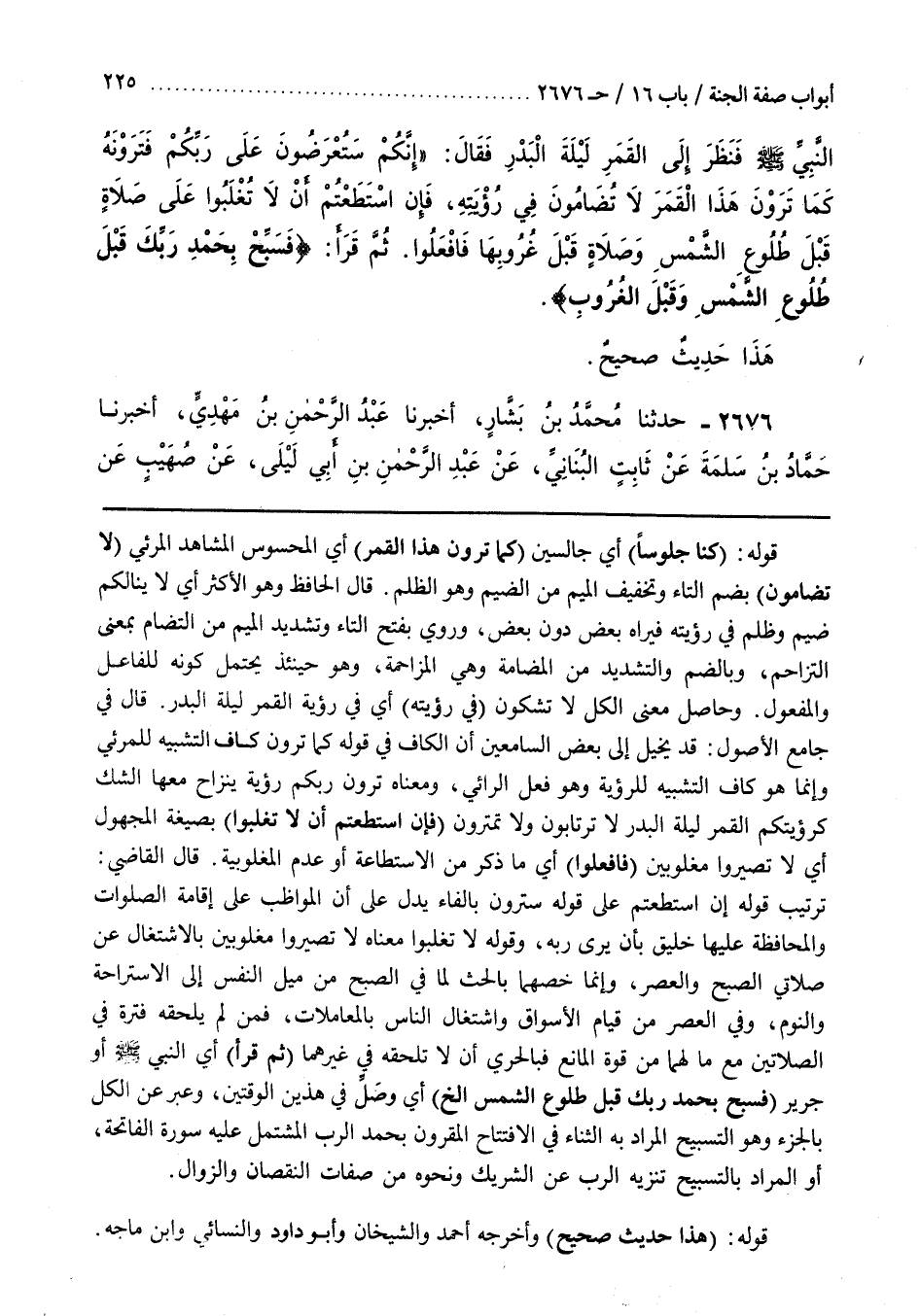 قَالَ الْقَاضِي تَرْتِيبُ قَوْلِهِ إِنِ اسْتَطَعْتُمْ عَلَى قَوْلِهِ سَتَرَوْنَ بِالْفَاءِ يَدُلُّ عَلَى أَنَّ الْمُوَاظِبَ عَلَى إِقَامَةِ الصَّلَوَاتِ وَالْمُحَافَظَةِ عَلَيْهَا خَلِيقٌ بِأَنْ يَرَى رَبَّهُ وَقَوْلُهُ لَا تُغْلَبُوا مَعْنَاهُ لَا تَصِيرُوا مَغْلُوبِينَ بِالِاشْتِغَالِ عَنْ صَلَاتَيِ الصُّبْحِ وَالْعَصْرِ وَإِنَّمَا خَصَّهُمَا بِالْحَثِّ لِمَا فِي الصُّبْحِ مِنْ مَيْلِ النَّفْسِ إِلَى الِاسْتِرَاحَةِ وَالنَّوْمِ وَفِي الْعَصْرِ مِنْ قِيَامِ الْأَسْوَاقِ وَاشْتِغَالِ النَّاسِ بِالْمُعَامَلَاتِ فَمَنْ لَمْ يَلْحَقْهُ فَتْرَةٌ فِي الصَّلَاتَيْنِ مَعَ مَا لَهُمَا مِنْ قُوَّةِ الْمَانِعِ فَبِالْحَرِيِّ أَنْ لَا تَلْحَقَهُ فِي غَيْرِهِمَا (ثُمَّ قَرَأَ) أَيِ النَّبِيُّ صَلَّى اللَّهُ عَلَيْهِ وَسَلَّمَ أَوْ جَرِيرٌ (فَسَبِّحْ بِحَمْدِ رَبِّكَ قَبْلَ طُلُوعِ الشَّمْسِ إِلَخْ) أَيْ وَصَلِّ فِي هَذَيْنِ الْوَقْتَيْنِ وَعَبَّرَ عَنِ الْكُلِّ بِالْجُزْءِ وَهُوَ التَّسْبِيحُ الْمُرَادُ بِهِ الثَّنَاءُ فِي الِافْتِتَاحِ الْمَقْرُونِ بِحَمْدِ الرَّبِّ الْمُشْتَمِلِ عَلَيْهِ سُورَةُ الْفَاتِحَةِ أَوِ الْمُرَادُ بِالتَّسْبِيحِ تَنْزِيهُ الرَّبِّ عَنِ الشَّرِيكِ وَنَحْوِهِ مِنْ صِفَاتِ النقصان والزوال