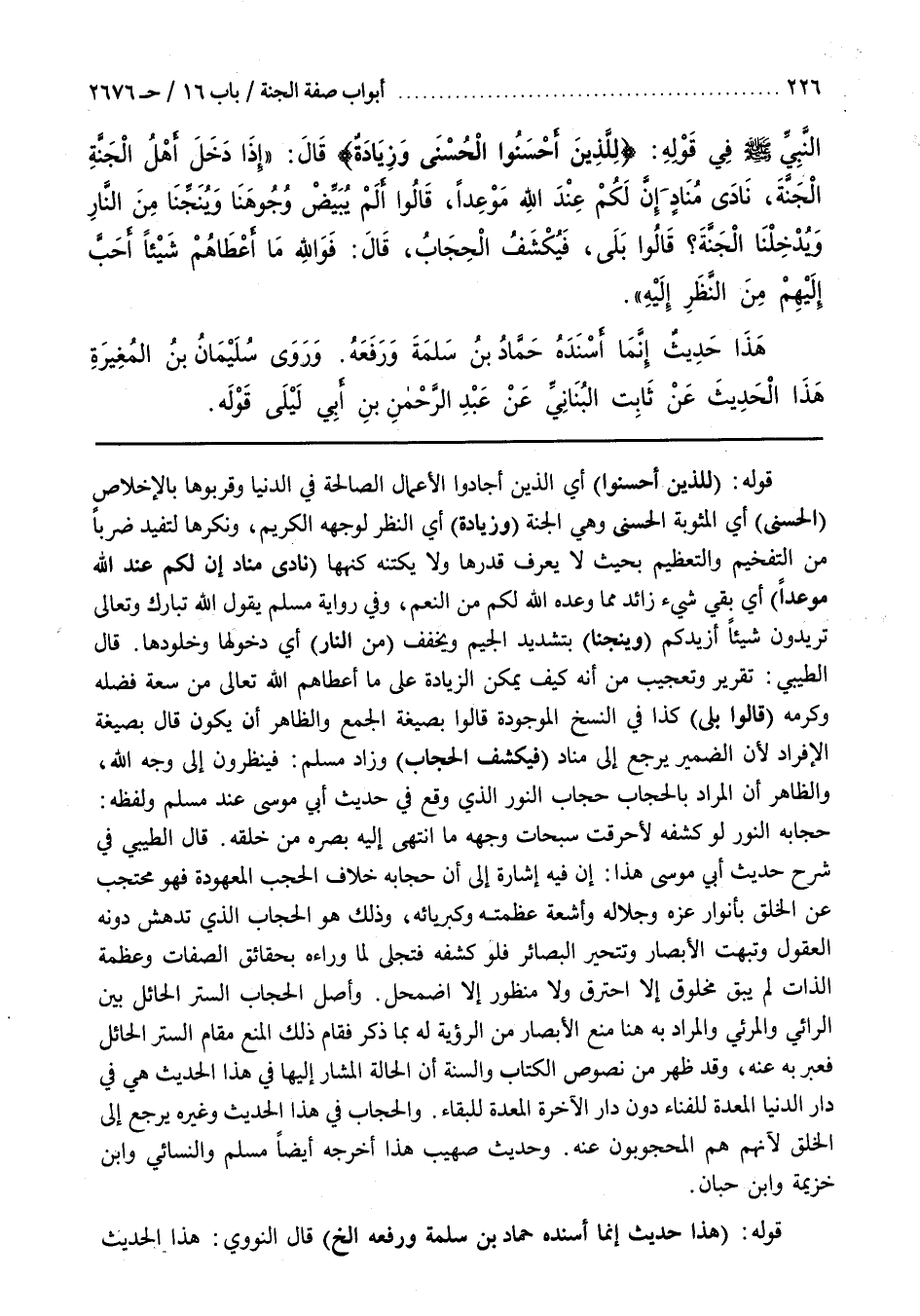 [2552] قوله (للذين أحسنوا) أَيِ الَّذِينَ أَجَادُوا الْأَعْمَالَ الصَّالِحَةَ فِي الدُّنْيَا وَقَرَّبُوهَا بِالْإِخْلَاصِ الْحُسْنَى أَيِ الْمَثُوبَةُ الْحُسْنَى وَهِيَ الْجَنَّةُ وَزِيَادَةٌ أَيِ النَّظَرُ لِوَجْهِهِ الْكَرِيمِ وَنَكَّرَهَا لِتُفِيدَ ضَرْبًا مِنَ التَّفْخِيمِ وَالتَّعْظِيمِ بِحَيْثُ لَا يُعْرَفُ قَدْرُهَا وَلَا يُكْتَنَهُ كُنْهُهَا (نَادَى مُنَادٍ إِنَّ لَكُمْ عِنْدَ اللَّهِ مَوْعِدًا) أَيْ بَقِيَ شَيْءٌ زَائِدٌ مِمَّا وَعَدَهُ اللَّهُ لَكُمْ مِنَ النِّعَمِ وَفِي رِوَايَةِ مُسْلِمٍ يَقُولُ اللَّهُ تَبَارَكَ وَتَعَالَى تُرِيدُونَ شَيْئًا أَزِيدُكُمْ (وَيُنَجِّنَا) بِتَشْدِيدِ الْجِيمِ وَيُخَفَّفُ (مِنَ النَّارِ) أَيْ دُخُولِهَا وَخُلُودِهَا