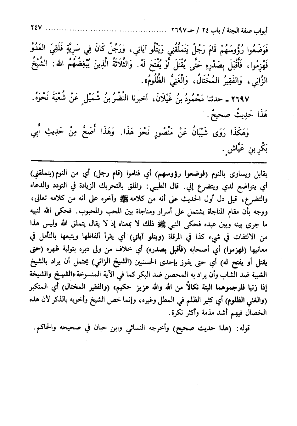 فَحَكَى اللَّهُ لِنَبِيِّهِ مَا جَرَى بَيْنَهُ وَبَيْنَ عَبْدِهِ فَحَكَى النَّبِيُّ صَلَّى اللَّهُ عَلَيْهِ وَسَلَّمَ ذَلِكَ لَا بِمَعْنَاهُ إِذْ لَا يُقَالُ يَتَمَلَّقُ اللَّهُ وَلَيْسَ هَذَا مِنَ الِالْتِفَاتِ فِي شَيْءٍ كَذَا فِي الْمِرْقَاةِ (وَيَتْلُو آيَاتِي) أي يقرأ ألفاظها وَيَتْبَعُهَا بِالتَّأَمُّلِ فِي مَعَانِيهَا (فَهُزِمُوا) أَيْ أَصْحَابُهُ (فأقبل بصدره) أي خلا مَنْ وَلَّى دُبُرَهُ بِتَوْلِيَةِ ظَهْرِهِ (حَتَّى يُقْتَلَ أَوْ يُفْتَحَ لَهُ) أَيْ حَتَّى يَفُوزَ بِإِحْدَى الْحُسْنَيَيْنِ (الشَّيْخُ الزَّانِي) يَحْتَمِلُ أَنْ يُرَادَ بِالشَّيْخِ الشَّيْبَةُ ضِدُّ الشَّابِّ وَأَنْ يُرَادَ بِهِ الْمُحْصَنُ ضِدُّ الْبِكْرِ كَمَا فِي الْآيَةِ الْمَنْسُوخَةِ الشَّيْخُ وَالشَّيْخَةُ إِذَا زَنَيَا فَارْجُمُوهُمَا الْبَتَّةَ نَكَالًا مِنَ اللَّهِ وَاَللَّهُ عَزِيزٌ حَكِيمٌ (وَالْفَقِيرُ الْمُخْتَالُ) أَيِ الْمُتَكَبِّرُ (وَالْغَنِيُّ الظَّلُومُ) أَيْ كَثِيرُ الظُّلْمِ فِي الْمَطْلِ وَغَيْرِهِ وَإِنَّمَا خُصَّ الشَّيْخُ وَأَخَوَيْهِ بِالذِّكْرِ لِأَنَّ هَذِهِ الْخِصَالَ فِيهِمْ أَشَدُّ مَذَمَّةً وَأَكْثَرُ نُكْرَةً