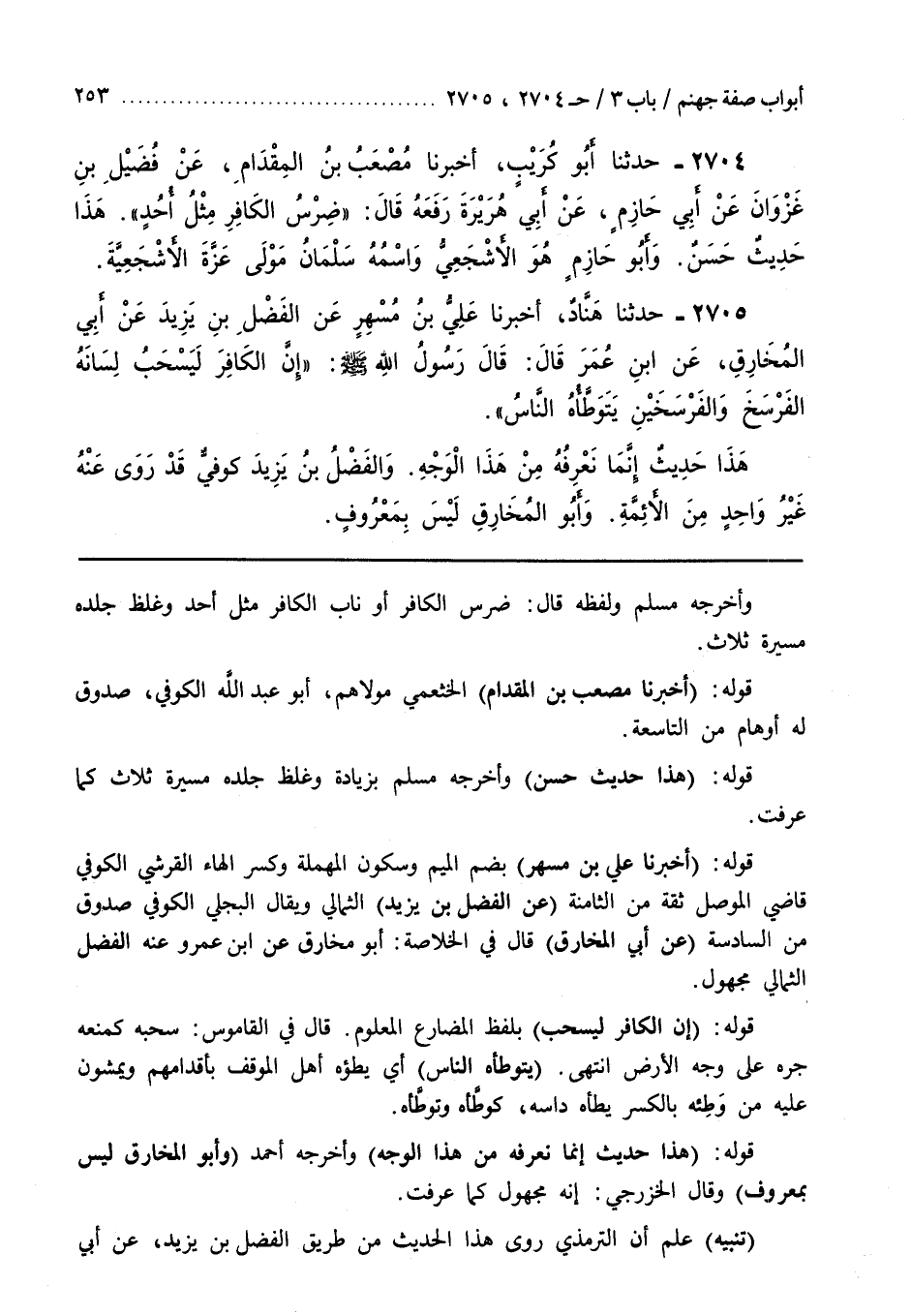 [2579] قَوْلُهُ (أَخْبَرَنَا مُصْعَبُ بْنُ الْمِقْدَامِ) الْخَثْعَمِيُّ مَوْلَاهُمْ أَبُو عَبْدِ اللَّهِ الْكُوفِيُّ صَدُوقٌ لَهُ أَوْهَامٌ مِنَ التَّاسِعَةِ قَوْلُهُ (هَذَا حَدِيثٌ حَسَنٌ) وَأَخْرَجَهُ مُسْلِمٌ بِزِيَادَةِ وَغِلَظُ جِلْدِهِ مَسِيرَةُ ثَلَاثٍ كَمَا عَرَفْتَ