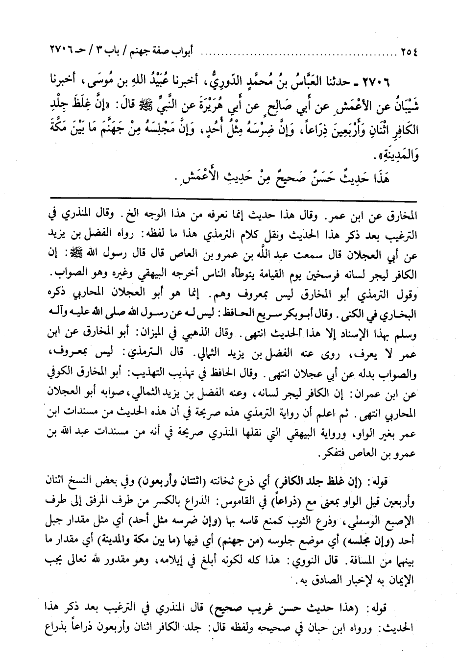 قَوْلُهُ (هَذَا حَدِيثٌ حَسَنٌ غَرِيبٌ صَحِيحٌ) قَالَ الْمُنْذِرِيُّ فِي التَّرْغِيبِ بَعْدَ ذِكْرِ هَذَا الْحَدِيثِ ورواه بن حِبَّانَ فِي صَحِيحِهِ وَلَفْظُهُ قَالَ جِلْدُ الْكَافِرِ اثْنَانِ وَأَرْبَعُونَ ذِرَاعًا بِذِرَاعِ