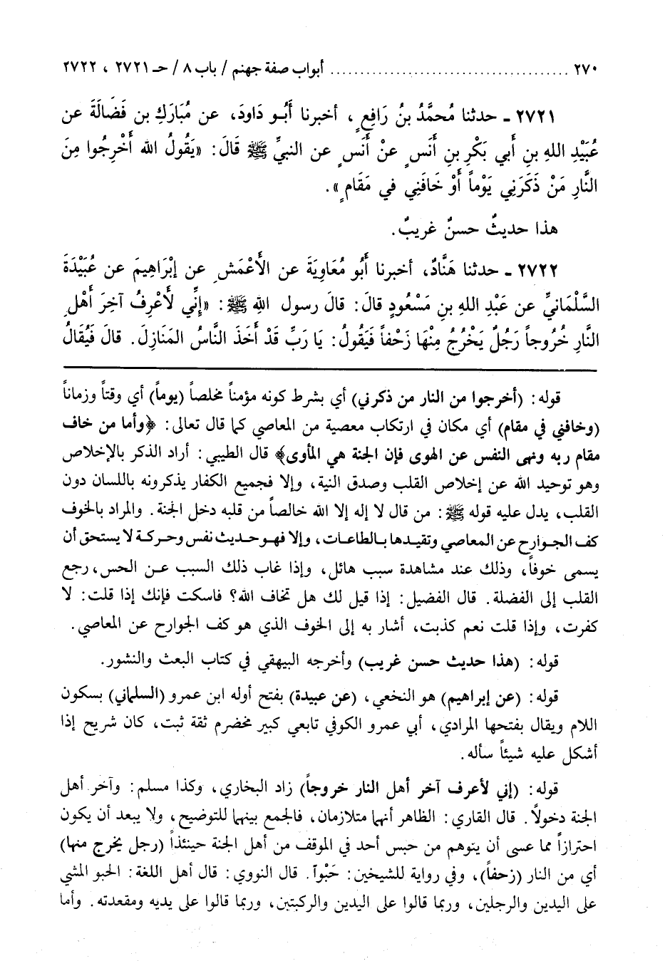 قال القارىء الظَّاهِرُ أَنَّهُمَا مُتَلَازِمَانِ فَالْجَمْعُ بَيْنَهُمَا لِلتَّوْضِيحِ وَلَا يَبْعُدُ أَنْ يَكُونَ احْتِرَازًا مِمَّا عَسَى أَنْ يُتَوَهَّمَ مِنْ حَبْسِ أَحَدٍ فِي الْمَوْقِفِ مِنْ أَهْلِ الْجَنَّةِ حِينَئِذٍ (رَجُلٌ يَخْرُجُ مِنْهَا) أَيْ مِنَ النَّارِ (زَحْفًا) وَفِي رِوَايَةٍ لِلشَّيْخَيْنِ حَبْوًا