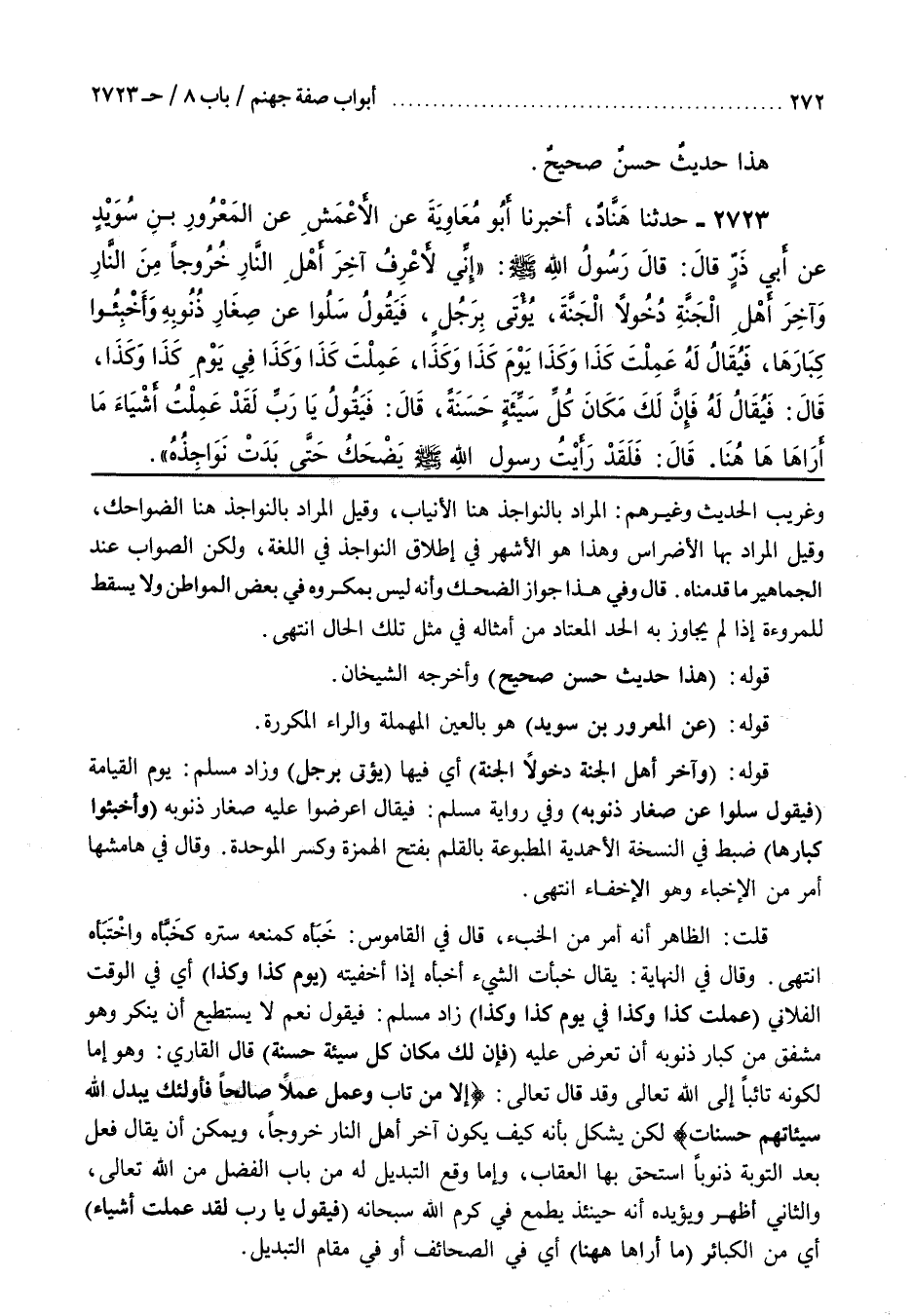 وَقَالَ فِي النِّهَايَةِ يُقَالُ خَبَّأْتُ الشيء أخبأه خبأ إِذَا أَخْفَيْتُهُ (يَوْمَ كَذَا وَكَذَا) أَيْ فِي الْوَقْتِ الْفُلَانِيِّ (عَمِلْتَ كَذَا وَكَذَا فِي يَوْمِ كَذَا وَكَذَا) زَادَ مُسْلِمٌ فَيَقُولُ نَعَمْ لَا يَسْتَطِيعُ أَنْ يُنْكِرَ وَهُوَ مُشْفِقٌ مِنْ كِبَارِ ذُنُوبِهِ أَنْ تُعْرَضَ عَلَيْهِ (فَإِنَّ لَكَ مَكَانَ كل سيئة حسنة) قال القارىء وَهُوَ إِمَّا لِكَوْنِهِ تَائِبًا إِلَى اللَّهِ تَعَالَى وقد قال تعالى إلا من تاب وَعَمِلَ عَمَلًا صَالِحًا فَأُولَئِكَ يُبَدِّلُ اللَّهُ سَيِّئَاتِهِمْ حسنات لَكِنْ يُشْكِلُ بِأَنَّهُ كَيْفَ يَكُونُ آخِرَ أَهْلِ النَّارِ خُرُوجًا وَيُمْكِنُ أَنْ يُقَالَ فَعَلَ بَعْدَ التَّوْبَةِ ذُنُوبًا اسْتَحَقَّ بِهَا الْعِقَابَ وَإِمَّا وَقَعَ التَّبْدِيلُ لَهُ مِنْ بَابِ الْفَضْلِ مِنَ اللَّهِ تَعَالَى وَالثَّانِي أَظْهَرُ وَيُؤَيِّدُهُ أَنَّهُ حِينَئِذٍ يَطْمَعُ فِي كَرَمِ اللَّهِ سُبْحَانَهُ (فَيَقُولُ يَا رَبِّ لَقَدْ عَمِلْتُ أَشْيَاءَ) أَيْ مِنَ الْكَبَائِرِ (مَا أراها ها هنا) أَيْ فِي الصَّحَائِفِ أَوْ فِي مَقَامِ التَّبْدِيلِ
