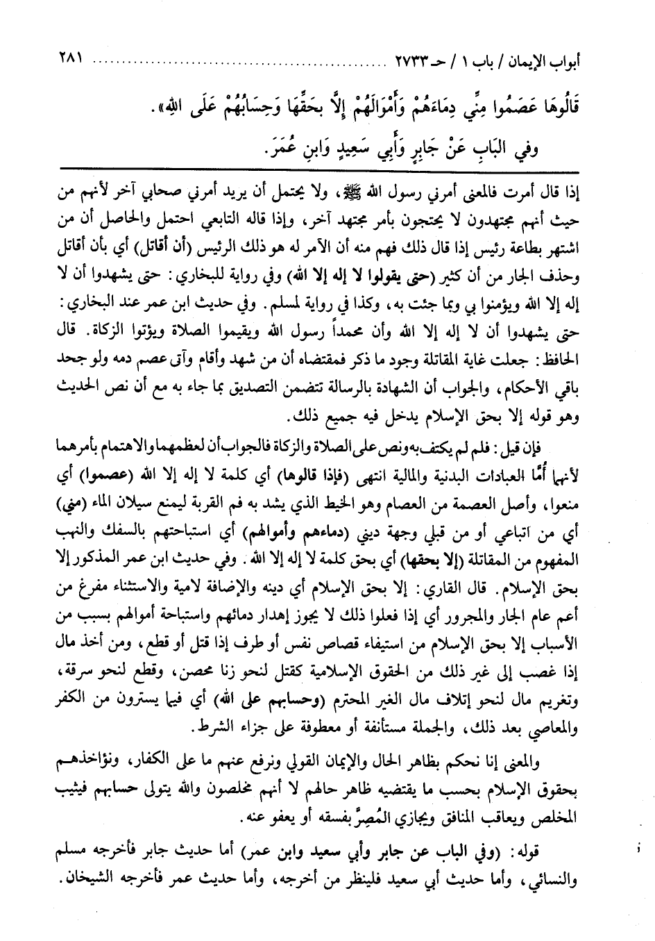 قال القارىء إِلَّا بِحَقِّ الْإِسْلَامِ أَيْ دِينِهِ وَالْإِضَافَةُ لَامِيَّةٌ وَالِاسْتِثْنَاءُ مُفَرَّغٌ مِنْ أَعَمَّ عَامِّ الْجَارِّ وَالْمَجْرُورِ أَيْ إِذَا فَعَلُوا ذَلِكَ لَا يَجُوزُ إِهْدَارُ دِمَائِهِمْ وَاسْتِبَاحَةُ أَمْوَالِهِمْ بِسَبَبٍ مِنَ الْأَسْبَابِ إِلَّا بِحَقِّ الْإِسْلَامِ مِنَ اسْتِيفَاءِ قِصَاصِ نَفْسٍ أَوْ طَرَفٍ إِذَا قَتَلَ أَوْ قَطَعَ وَمِنْ أَخْذِ مَالٍ إِذَا غَصَبَ إِلَى غَيْرِ ذَلِكَ مِنَ الْحُقُوقِ الْإِسْلَامِيَّةِ كَقَتْلٍ لِنَحْوِ زِنَا مُحْصَنٍ وَقَطْعٍ لِنَحْوِ سَرِقَةٍ وَتَغْرِيمِ مَالٍ لِنَحْوِ إِتْلَافِ مَالِ الْغَيْرِ الْمُحْتَرَمِ (وَحِسَابُهُمْ عَلَى اللَّهِ) أَيْ فِيمَا يَسْتُرُونَ مِنَ الْكُفْرِ وَالْمَعَاصِي بَعْدَ ذَلِكَ
