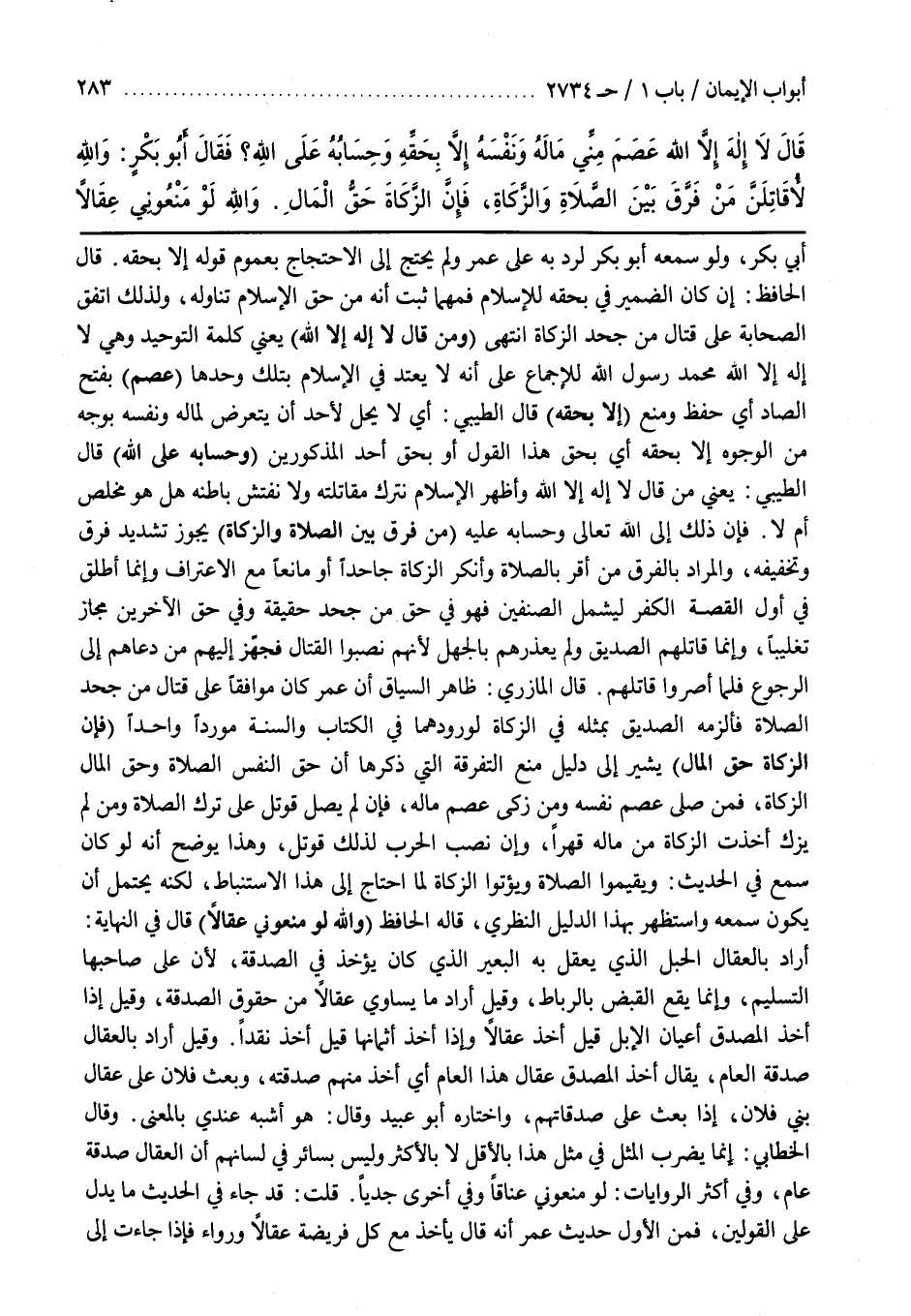 قَالَ الْمَازِرِيُّ ظَاهِرُ السِّيَاقِ أَنَّ عُمَرَ كَانَ مُوَافِقًا عَلَى قِتَالِ مَنْ جَحَدَ الصَّلَاةَ فَأَلْزَمَهُ الصِّدِّيقُ بِمِثْلِهِ فِي الزَّكَاةِ لِوُرُودِهِمَا فِي الْكِتَابِ وَالسُّنَّةِ مَوْرِدًا وَاحِدًا (فَإِنَّ الزَّكَاةَ حَقُّ الْمَالِ) يُشِيرُ إِلَى دَلِيلِ مَنْعِ التَّفْرِقَةِ الَّتِي ذَكَرَهَا أَنَّ حَقَّ النَّفْسِ الصَّلَاةُ وَحَقَّ الْمَالِ الزَّكَاةُ فَمَنْ صَلَّى عَصَمَ نَفْسَهُ وَمَنْ زَكَّى عَصَمَ مَالَهُ فَإِنْ لَمْ يُصَلِّ قُوتِلَ عَلَى تَرْكِ الصَّلَاةِ وَمَنْ لَمْ يُزَكِّ أُخِذَتِ الزَّكَاةُ مِنْ مَالِهِ قَهْرًا وَإِنْ نَصَبَ الْحَرْبَ لِذَلِكَ قُوتِلَ وَهَذَا يُوَضِّحُ أَنَّهُ لَوْ كَانَ سَمِعَ فِي الْحَدِيثِ وَيُقِيمُوا الصَّلَاةَ وَيُؤْتُوا الزَّكَاةَ لَمَا احْتَاجَ إِلَى هَذَا الِاسْتِنْبَاطِ لَكِنَّهُ يُحْتَمَلُ أَنْ يَكُونَ سَمِعَهُ وَاسْتَظْهَرَ بِهَذَا الدَّلِيلِ النَّظَرِيِّ قَالَهُ الْحَافِظُ (وَاللَّهِ لَوْ مَنَعُونِي عِقَالًا) قَالَ فِي النِّهَايَةِ أَرَادَ بِالْعِقَالِ الْحَبْلَ الَّذِي يُعْقَلُ بِهِ الْبَعِيرُ الَّذِي كَانَ يُؤْخَذُ فِي الصَّدَقَةِ لِأَنَّ عَلَى صَاحِبِهَا التَّسْلِيمَ وَإِنَّمَا يَقَعُ الْقَبْضُ بِالرِّبَاطِ وَقِيلَ أَرَادَ مَا يُسَاوِي عِقَالًا مِنْ حُقُوقِ الصَّدَقَةِ وَقِيلَ إِذَا أَخَذَ الْمُصَدِّقُ أَعْيَانَ الْإِبِلِ قِيلَ أَخَذَ عِقَالًا وَإِذَا أَخَذَ أَثْمَانَهَا قِيلَ أَخَذَ نَقْدًا