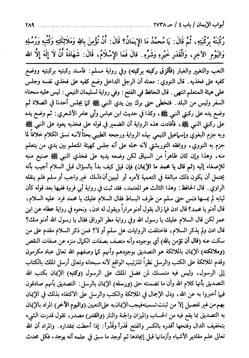 قَالَ الْحَافِظُ وَهَذَا الثَّالِثُ هُوَ الْمُعْتَمَدُ فَقَدْ ثَبَتَ فِي رِوَايَةِ أَبِي فَرْوَةَ فَفِيهَا بَعْدَ قَوْلِهِ كَأَنَّ ثِيَابَهُ لَمْ يَمَسَّهَا دَنَسٌ حَتَّى سَلَّمَ مِنْ طَرَفِ الْبِسَاطِ فَقَالَ السَّلَامُ عَلَيْكَ يَا مُحَمَّدُ فَرَدَّ عَلَيْهِ السَّلَامَ قَالَ أُدْنُوا يَا مُحَمَّدُ قَالَ ادْنُ فَمَا زَالَ يَقُولُ أَدْنُو مِرَارًا وَيَقُولُ لَهُ ادْنُ وَنَحْوِهِ فِي رِوَايَةِ عَطَاءٍ عَنِ بن عُمَرَ لَكِنْ قَالَ السَّلَامُ عَلَيْكَ يَا رَسُولَ اللَّهِ وَفِي رِوَايَةٍ مَطَرٍ الْوَرَّاقِ فَقَالَ رَسُولُ اللَّهِ أَدْنُو مِنْكَ قَالَ ادْنُ وَلَمْ يَذْكُرِ السلام فاختلفت الروايات هل سلم أولا فَمَنْ ذَكَرَ السَّلَامَ مُقَدَّمٌ عَلَى مَنْ سَكَتَ عَنْهُ (قَالَ أَنْ تُؤْمِنَ بِاللَّهِ) أَيْ بِوُجُودِهِ وَأَنَّهُ مُتَّصِفٌ بِصِفَاتِ الْكَمَالِ مُنَزَّهٌ عَنْ صِفَاتِ النَّقْصِ (وَمَلَائِكَتِهِ) الْإِيمَانُ بِالْمَلَائِكَةِ هُوَ التَّصْدِيقُ بِوُجُودِهِمْ وَأَنَّهُمْ كَمَا وَصَفَهُمُ اللَّهُ تَعَالَى عِبَادٌ مُكْرَمُونَ وَقَدَّمَ الْمَلَائِكَةَ عَلَى الْكُتُبِ وَالرُّسُلِ نَظَرًا لِلتَّرْتِيبِ الْوَاقِعِ لِأَنَّهُ سُبْحَانَهُ وَتَعَالَى أَرْسَلَ الْمَلَكَ بِالْكِتَابِ إِلَى الرَّسُولِ وَلَيْسَ فِيهِ مُتَمَسَّكٌ لِمَنْ فَضَّلَ الْمَلَكَ عَلَى الرَّسُولِ (وَكُتُبِهِ) الْإِيمَانُ بِكُتُبِ اللَّهِ التَّصْدِيقُ بِأَنَّهَا كَلَامُ اللَّهِ وَأَنَّ مَا تَضَمَّنَتْهُ حَقٌّ (وَرُسُلِهِ) الْإِيمَانُ بِالرُّسُلِ التَّصْدِيقُ بِأَنَّهُمْ صَادِقُونَ فِيمَا أَخْبَرُوا بِهِ عَنِ اللَّهِ وَدَلَّ الْإِجْمَالُ فِي الْمَلَائِكَةِ وَالْكُتُبِ وَالرُّسُلِ عَلَى الِاكْتِفَاءِ بِذَلِكَ في الإيمان بهم غَيْرِ تَفْصِيلٍ إِلَّا مَنْ ثَبَتَتْ تَسْمِيَتُهُ فَيَجِبُ الْإِيمَانُ بِهِ عَلَى التَّعْيِينِ (وَالْيَوْمِ الْآخِرِ) الْمُرَادُ بِالْإِيمَانِ بِهِ التَّصْدِيقُ بِمَا يَقَعُ فِيهِ مِنَ الْحِسَابِ وَالْمِيزَانِ وَالْجَنَّةِ وَالنَّارِ (وَالْقَدَرِ) مَصْدَرٌ تَقُولُ قَدَرْتُ الشَّيْءَ بِتَخْفِيفِ الدَّالِ وَفَتْحِهَا أَقْدِرُهُ بِالْكَسْرِ وَالْفَتْحِ قَدْرًا وَقَدَرًا إِذَا أَحَطْتُ بِمِقْدَارِهِ