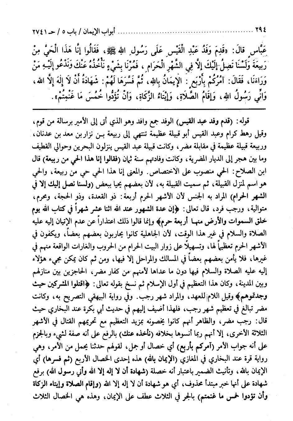 وَفِي رِوَايَةِ الْبَيْهَقِيِّ التَّصْرِيحُ بِهِ وَكَانَتْ مُضَرُ تُبَالِغُ فِي تَعْظِيمِ شَهْرِ رَجَبٍ فَلِهَذَا أُضِيفَ إِلَيْهِمْ فِي حَدِيثِ أَبِي بَكْرَةَ عِنْدَ الْبُخَارِيِّ حَيْثُ قَالَ رَجَبُ مُضَرَ وَالظَّاهِرُ أَنَّهُمْ كَانُوا يَخُصُّونَهُ بِمَزِيدِ التَّعْظِيمِ مَعَ تَحْرِيمِهِمُ الْقِتَالَ فِي الْأَشْهُرِ الثَّلَاثَةِ الْأُخْرَى إِلَّا أَنَّهُمْ رُبَّمَا أَنِسُوهَا بِخِلَافِهِ (نَأْخُذُهُ عَنْكَ) بِالرَّفْعِ عَلَى أَنَّهُ صِفَةٌ لِشَيْءٍ وَبِالْجَزْمِ عَلَى أَنَّهُ جَوَابُ الْأَمْرِ (آمُرُكُمْ بِأَرْبَعٍ) أَيْ خِصَالٍ أَوْ جُمَلٍ لِقَوْلِهِمْ حَدِّثْنَا يُحْمَلُ مِنَ الْأَمْرِ وَهِيَ رِوَايَةُ قُرَّةَ عِنْدَ الْبُخَارِيِّ فِي الْمَغَازِي (الْإِيمَانُ بِاللَّهِ) هَذِهِ إِحْدَى الْخِصَالِ الْأَرْبَعِ (ثُمَّ فَسَّرَهَا) أَيِ الْإِيمَانَ بِاللَّهِ وَتَأْنِيثُ الضَّمِيرِ بِاعْتِبَارِ أَنَّهُ خُصْلَةٌ (شَهَادَةُ أَنْ لَا إِلَهَ إِلَّا اللَّهُ وَأَنِّي رَسُولُ اللَّهِ) بِرَفْعِ شَهَادَةُ عَلَى أَنَّهَا خَبَرُ مُبْتَدَأٍ مَحْذُوفٍ أَيْ هُوَ شَهَادَةُ أَنْ لَا إِلَهَ إِلَّا اللَّهُ (وَإِقَامُ الصَّلَاةِ وَإِيتَاءُ الزَّكَاةِ وَأَنْ تُؤَدُّوا خُمُسَ مَا غَنِمْتُمْ) بِالْجَرِّ فِي الثَّلَاثِ عَطْفٌ عَلَى الْإِيمَانِ وَهَذِهِ هِيَ الْخِصَالُ الثَّلَاثُ