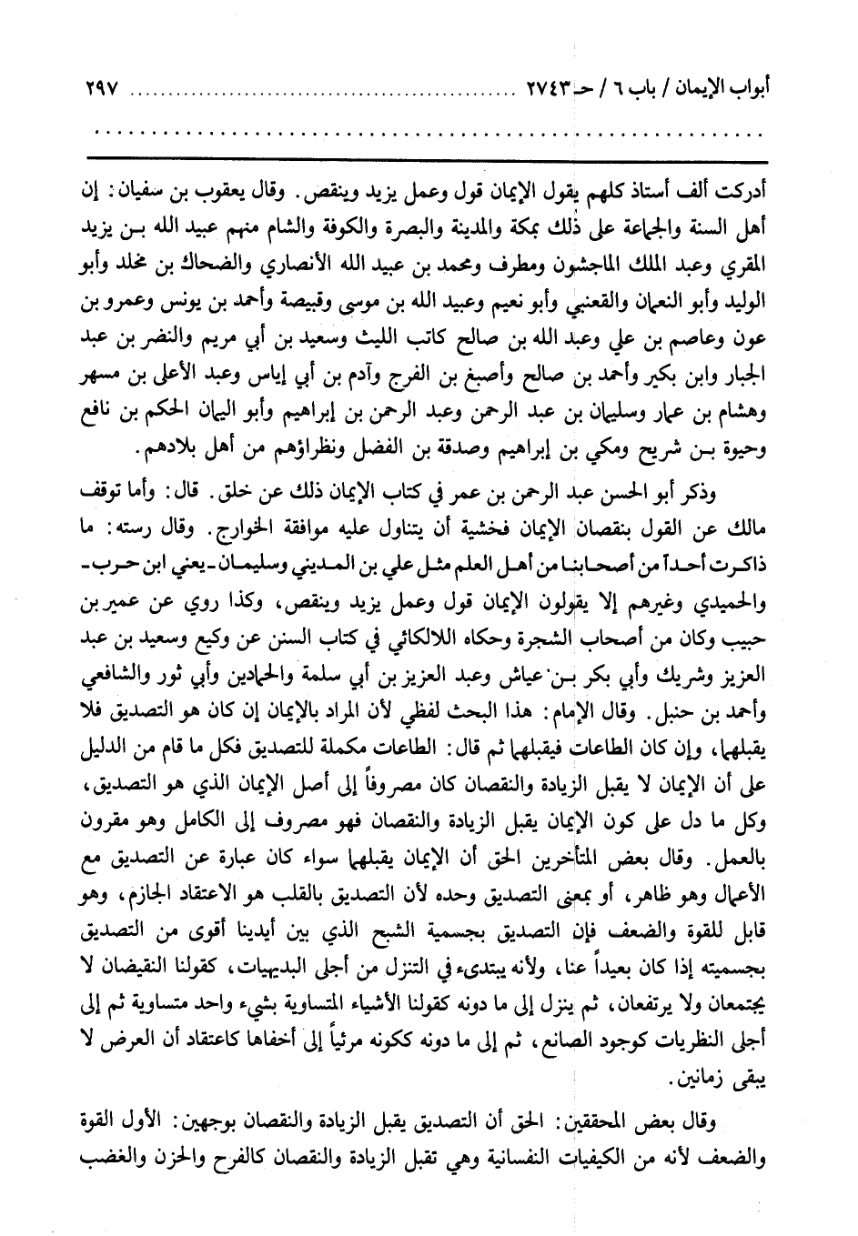 وَقَالَ رُسْتَهْ مَا ذَاكَرْتُ أَحَدًا مِنْ أَصْحَابِنَا مِنْ أَهْلِ الْعِلْمِ مِثْلَ عَلِيِّ بْنِ المديني وسليمان يعني بن حَرْبٍ وَالْحُمَيْدِيَّ وَغَيْرَهُمْ إِلَّا يَقُولُونَ الْإِيمَانُ قَوْلٌ وَعَمَلٌ يَزِيدُ وَيَنْقُصُ وَكَذَا رُوِيَ عَنْ عُمَيْرِ بْنِ حَبِيبٍ وَكَانَ مِنْ أَصْحَابِ الشَّجَرَةِ وَحَكَاهُ اللَّالَكَائِيُّ فِي كِتَابِ السُّنَنِ عَنْ وَكِيعٍ وَسَعِيدِ بْنِ عَبْدِ الْعَزِيزِ وَشَرِيكٍ وَأَبِي بَكْرِ بْنِ عياش وعبد العزيز بن أبي سلمة وَالْحَمَّادَيْنِ وَأَبِي ثَوْرٍ وَالشَّافِعِيِّ وَأَحْمَدَ بْنِ حَنْبَلٍ