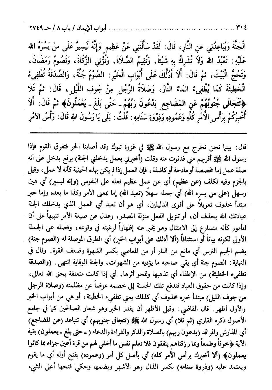 قَالَ بَيْنَمَا نَحْنُ نَخْرُجُ مَعَ رَسُولِ اللَّهِ صَلَّى اللَّهُ عَلَيْهِ وَسَلَّمَ فِي غَزْوَةِ تَبُوكَ وَقَدْ أَصَابَنَا الْحَرُّ فَتَفَرَّقَ الْقَوْمُ فَإِذَا رَسُولُ اللَّهِ صَلَّى اللَّهُ عَلَيْهِ وَسَلَّمَ أَقْرَبُهُمْ مِنِّي فَدَنَوْتُ مِنْهُ وَقُلْتُ (أَخْبِرْنِي بِعَمَلٍ يُدْخِلُنِي الْجَنَّةَ) بِرَفْعِ يُدْخِلُ عَلَى أَنَّهُ صِفَةُ عَمَلٍ إِمَّا مُخَصِّصَةٌ أَوْ مَادِحَةٌ أَوْ كَاشِفَةٌ فَإِنَّ الْعَمَلَ إِذَا لَمْ يَكُنْ بِهَذِهِ الْحَيْثِيَّةِ كَأَنَّهُ لَا عَمَلَ وَقِيلَ بِالْجَزْمِ وَفِيهِ تَكَلُّفٌ (عَنْ عَظِيمٍ) أَيْ عَنْ عَمَلٍ عَظِيمٍ فِعْلُهُ عَلَى النُّفُوسِ (وَإِنَّهُ لَيَسِيرٌ) أَيْ هَيِّنٌ سَهْلٌ (عَلَى مَنْ يَسَّرَهُ اللَّهُ) أَيْ جَعَلَهُ سَهْلًا (تَعْبُدُ اللَّهَ) إِمَّا بِمَعْنَى الْأَمْرِ وَكَذَا مَا بَعْدَهُ وَإِمَّا خَبَرُ مُبْتَدَأٍ مَحْذُوفٍ تَعْوِيلًا عَلَى أَقْوَى الدَّلِيلَيْنِ أَيْ هُوَ أَنْ تَعْبُدَ أَيِ الْعَمَلُ الَّذِي يُدْخِلُكَ الْجَنَّةَ عِبَادَتُكُ اللَّهَ بِحَذْفِ أَنْ أَوْ تَنْزِيلُ الْفِعْلِ مَنْزِلَةَ الْمَصْدَرِ وَعَدَلَ عَنْ صِيغَةِ الْأَمْرِ تَنْبِيهًا عَلَى أَنَّ الْمَأْمُورَ كَأَنَّهُ مُتَسَارِعٌ إِلَى الِامْتِثَالِ وَهُوَ يُخْبِرُ عَنْهُ إِظْهَارًا لِرَغْبَتِهِ فِي وُقُوعِهِ وَفَصَلَهُ عَنِ الْجُمْلَةِ الْأُولَى لِكَوْنِهِ بَيَانًا أَوِ اسْتِئْنَافًا (أَلَا أَدُلُّكَ عَلَى أَبْوَابِ الْخَيْرِ) أَيِ الطُّرُقِ الْمُوَصِّلَةِ بِهِ (الصَّوْمُ جُنَّةٌ) بِضَمِّ الْجِيمِ التُّرْسُ أَيْ مَانِعٌ مِنَ النَّارِ أَوْ مِنَ الْمَعَاصِي بِكَسْرَةِ الشَّهْوَةِ وَضَعْفِ الْقُوَّةِ