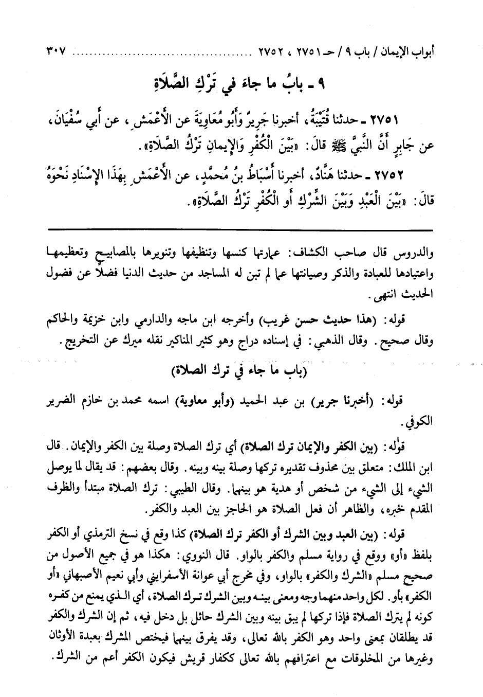 [2619] قَوْلُهُ (بَيْنَ الْعَبْدِ وَبَيْنَ الشِّرْكِ أَوِ الْكُفْرِ تَرْكُ الصَّلَاةِ) كَذَا وَقَعَ فِي نُسَخِ التِّرْمِذِيِّ أَوِ الْكُفْرِ بِلَفْظِ أَوْ وَوَقَعَ فِي رِوَايَةِ مُسْلِمٍ وَالْكُفْرِ بِالْوَاوِ