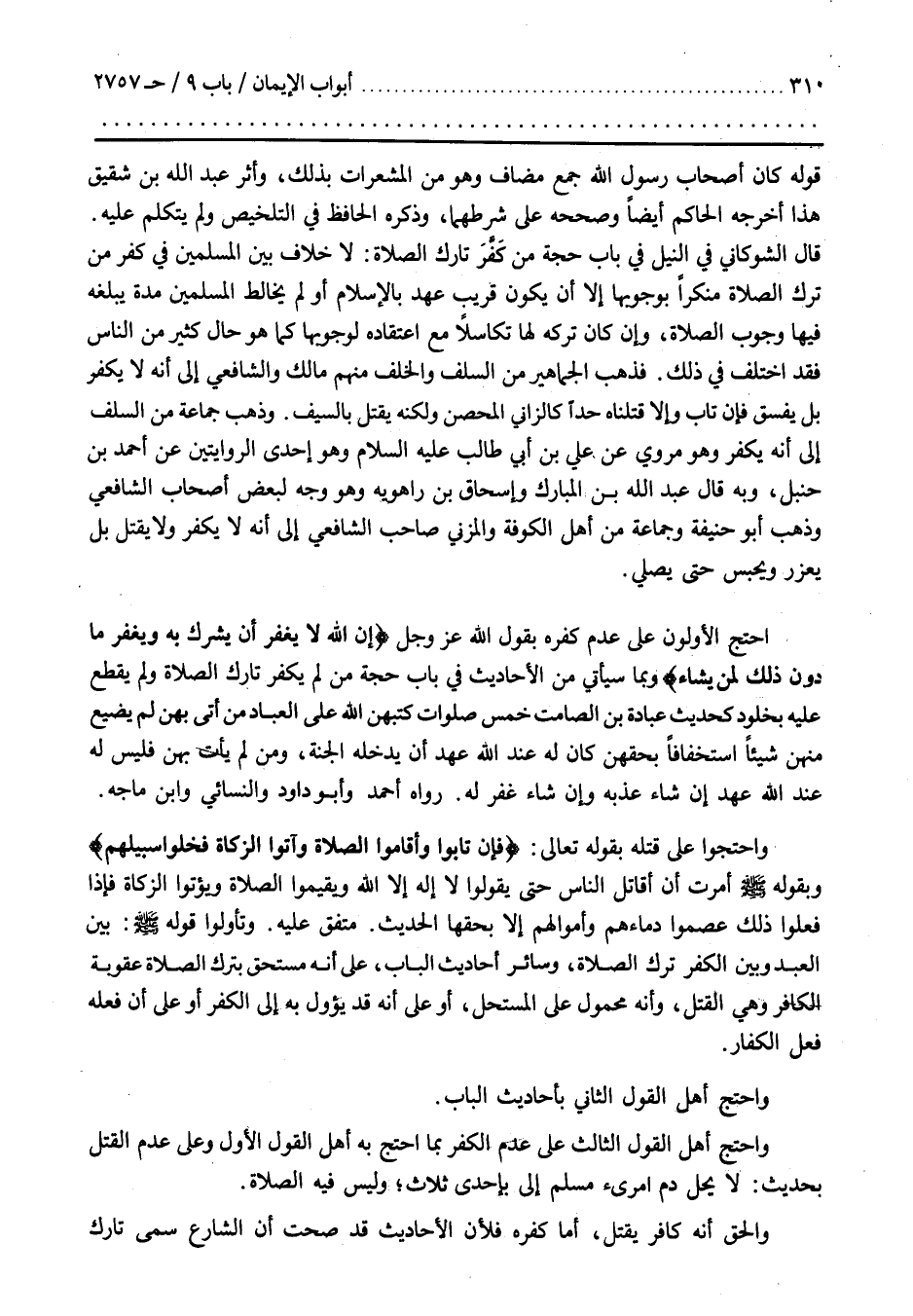 وَاحْتَجُّوا عَلَى قَتْلِهِ بِقَوْلِهِ تَعَالَى فَإِنْ تابوا وأقاموا الصلاة وأتوا الزكاة فخلوا سبيلهم وَبِقَوْلِهِ صَلَّى اللَّهُ عَلَيْهِ وَسَلَّمَ أُمِرْتُ أَنْ أُقَاتِلَ النَّاسَ حَتَّى يَقُولُوا لَا إِلَهَ إِلَّا اللَّهُ وَيُقِيمُوا الصَّلَاةَ وَيُؤْتُوا الزَّكَاةَ فَإِذَا فَعَلُوا ذَلِكَ عَصَمُوا دِمَاءَهُمْ وَأَمْوَالَهُمْ إِلَّا بِحَقِّهَا الْحَدِيثَ